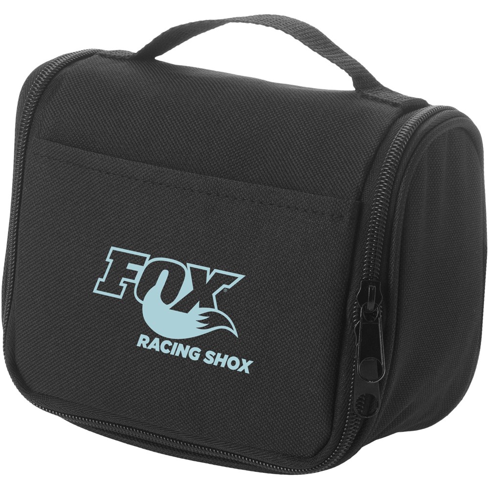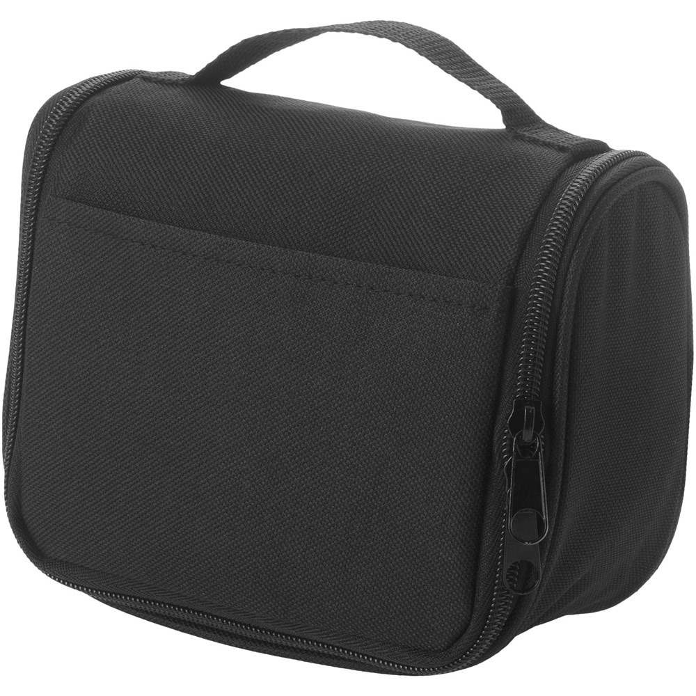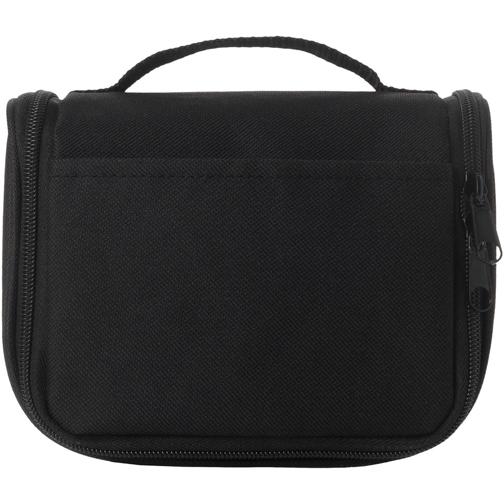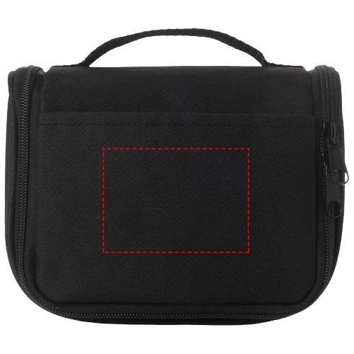 Slimme, compacte toiletset met ophanghaakje aan de achterkant. Hoofdvak met verstevigde elastieken vakjes voor toiletartikelen en handige vakjes van gaasstof.