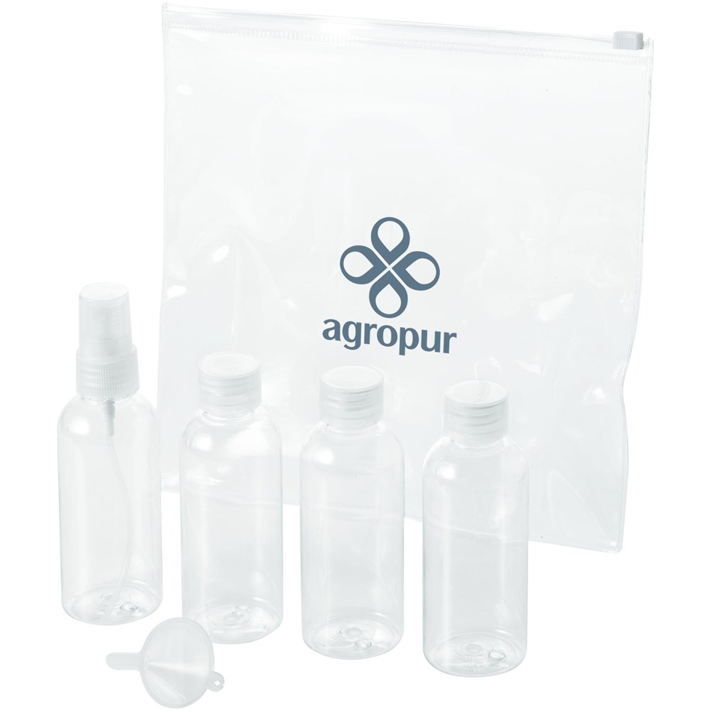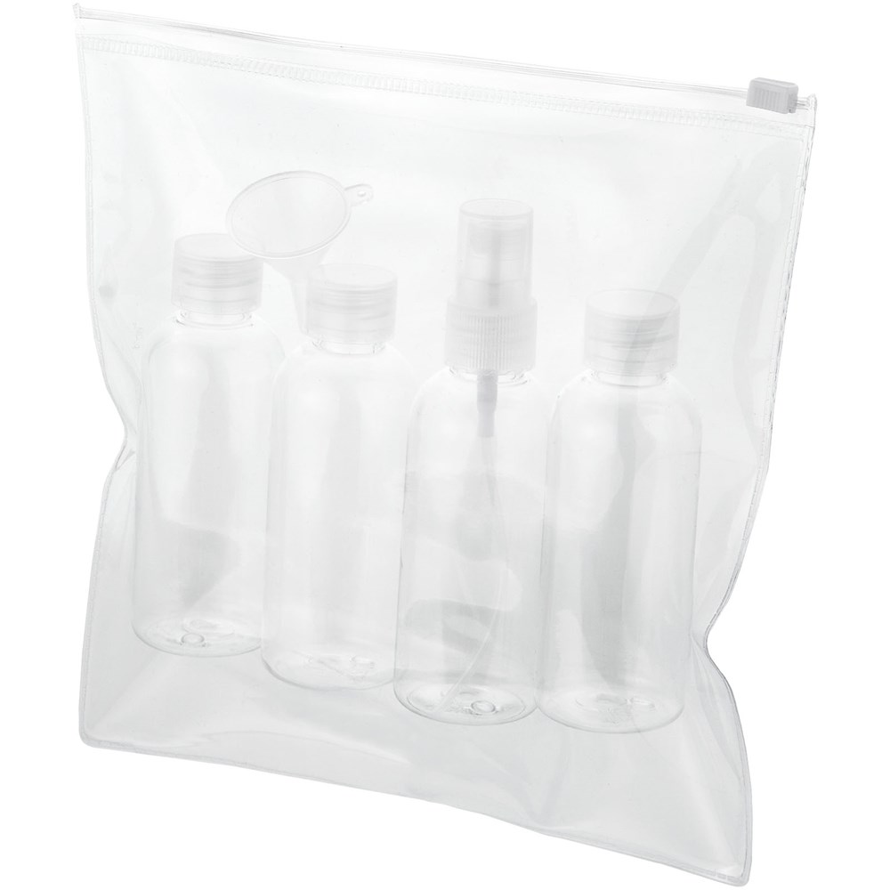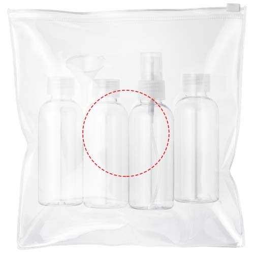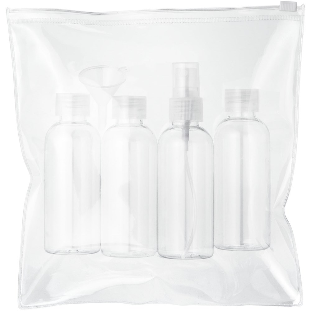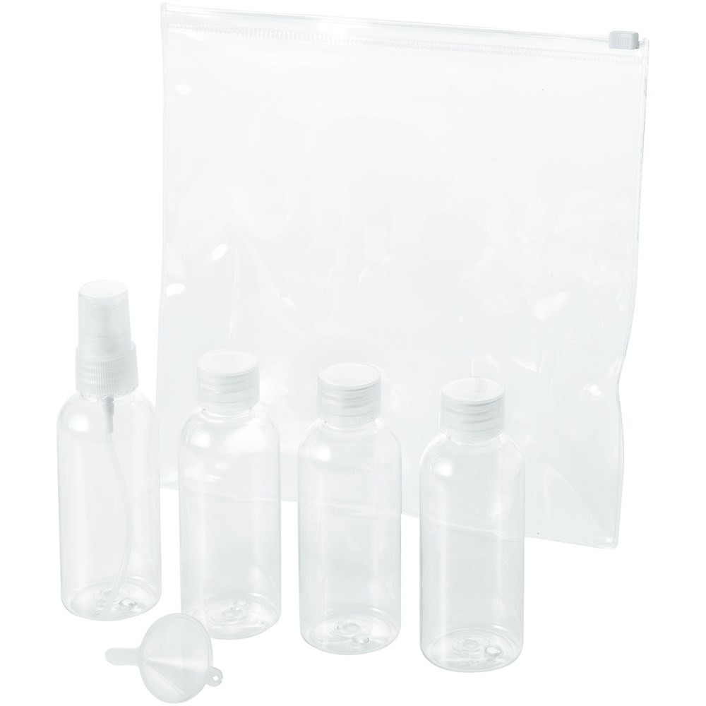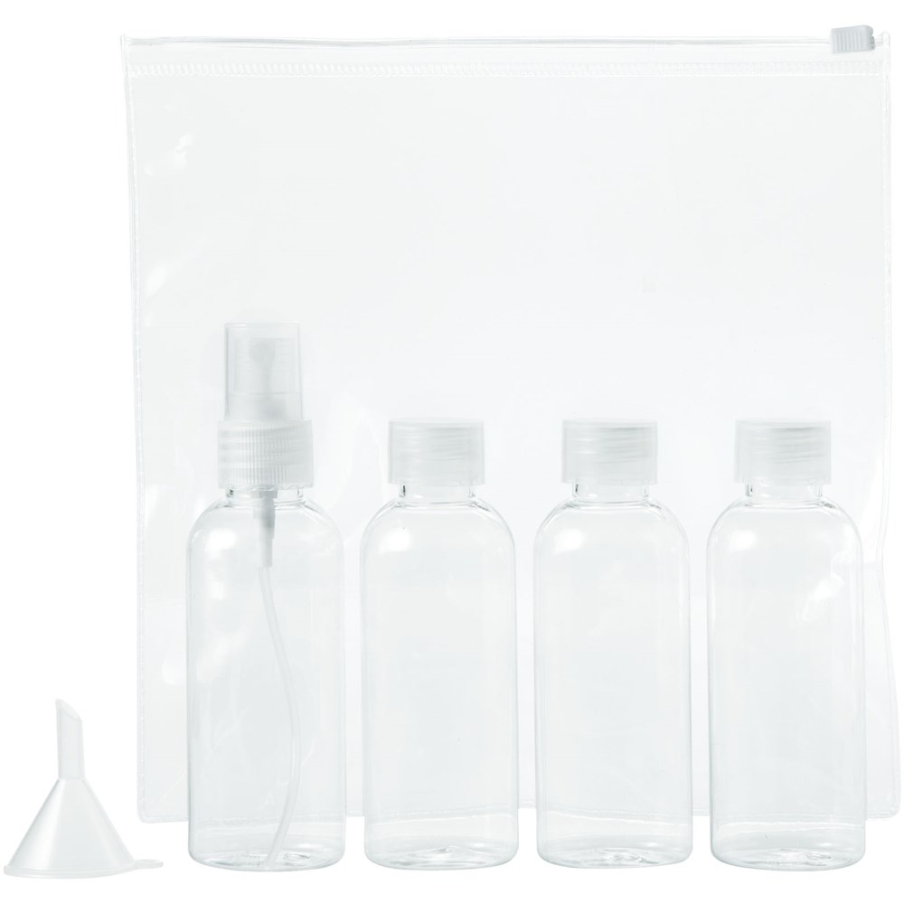 Controlevriendelijk etui met ritssluiting. Bevat 3 60ml navulbare flesjes en een 60ml navulbare spray met mini-trechter. Decoratie is alleen mogelijk op het etui zelf, niet op de accessoires.