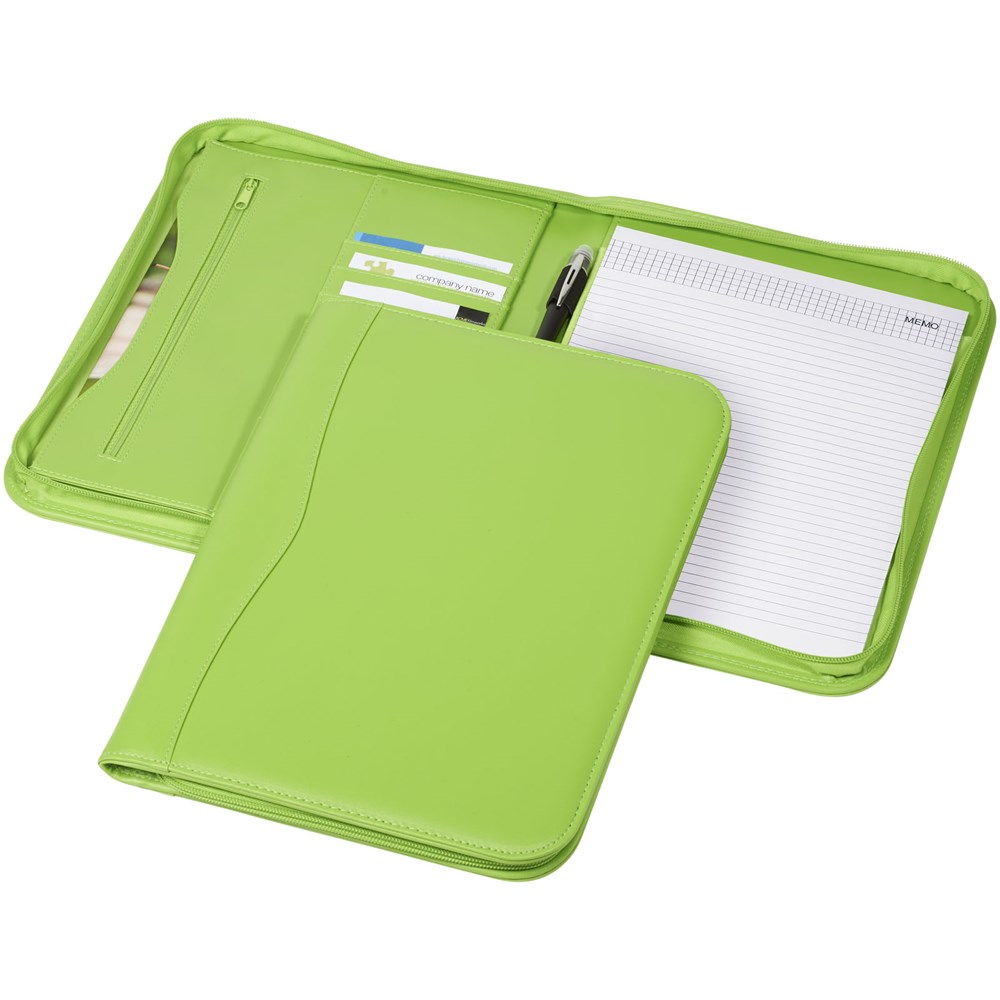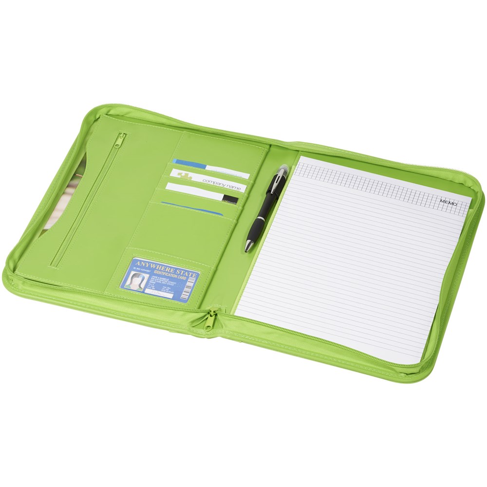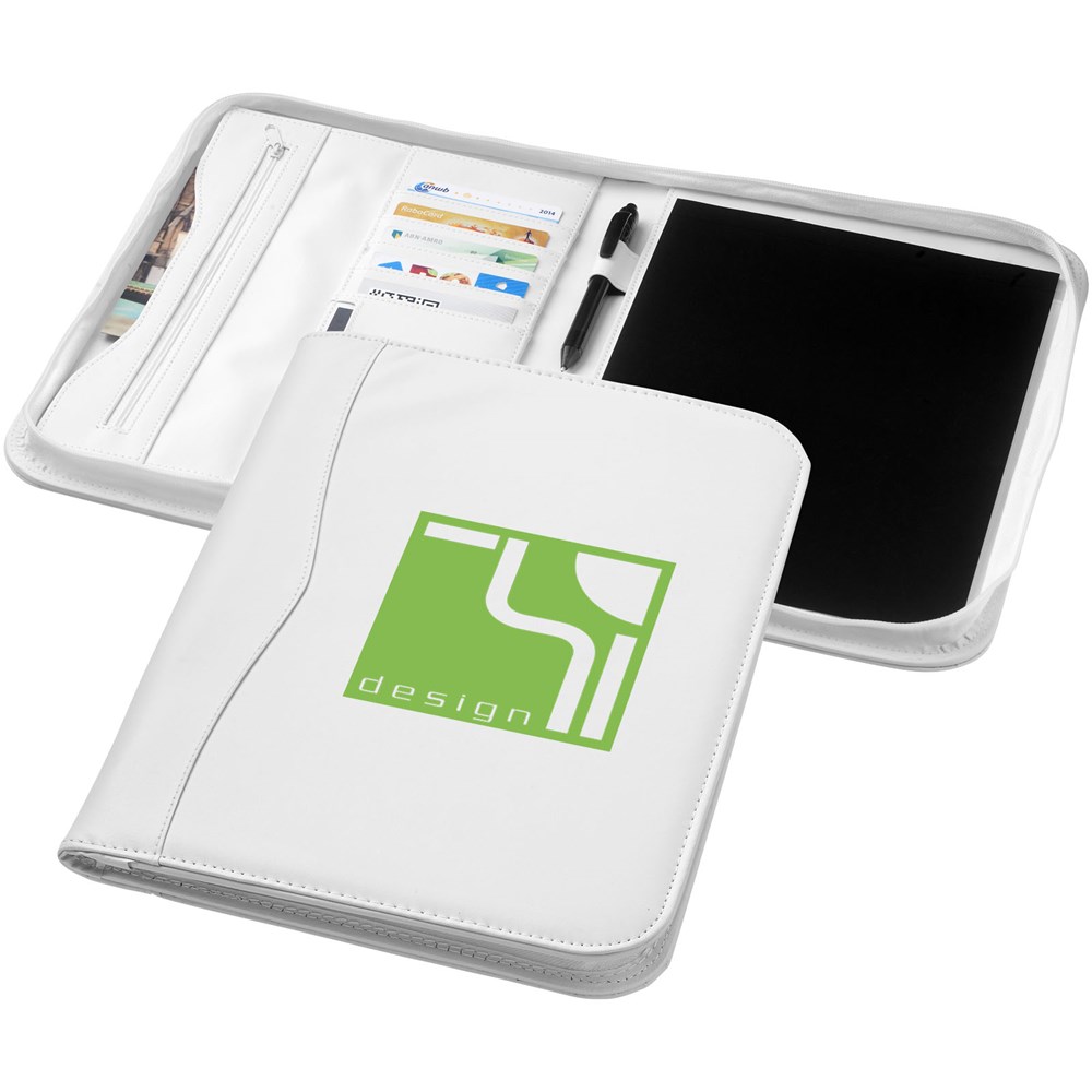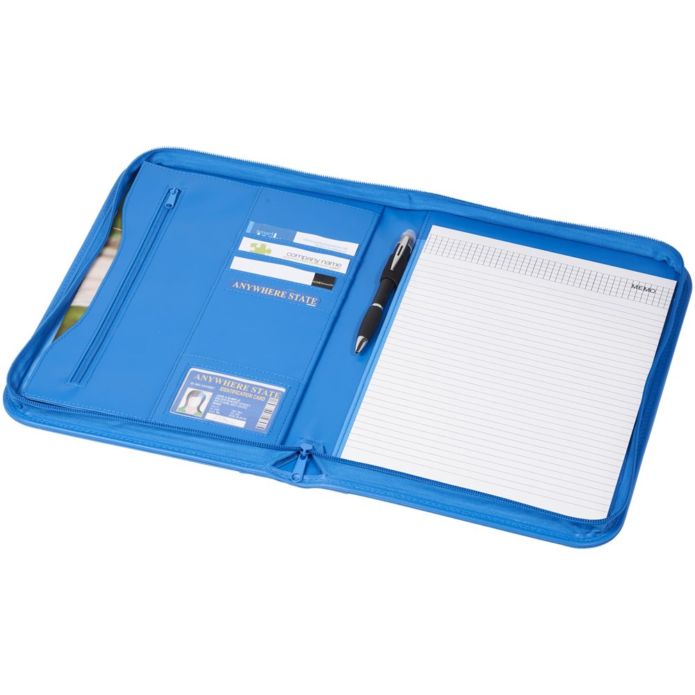 Portfolio A4 formaat met ritssluiting, ritsvak, pennenlus, documentvakken en notitieblok met 20 pagina's gelinieerd papier. Pen en accessoires niet inbegrepen.