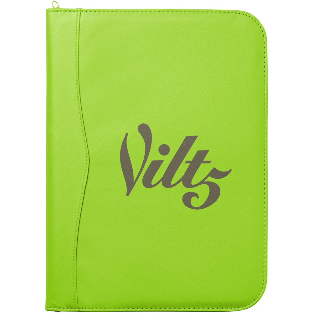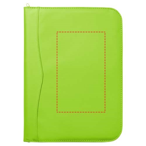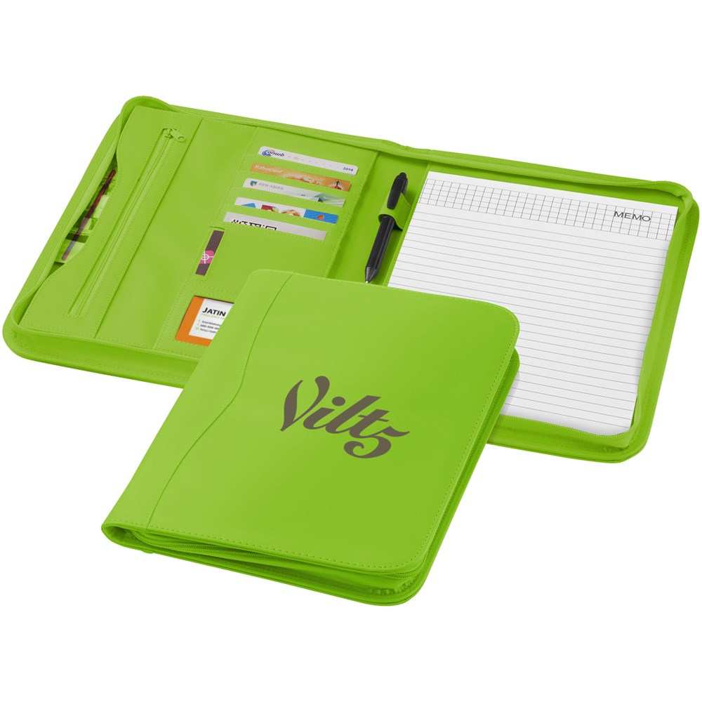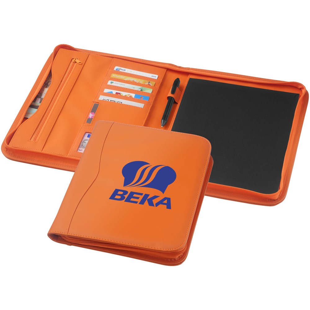 Portfolio A4 formaat met ritssluiting, ritsvak, pennenlus, documentvakken en notitieblok met 20 pagina's gelinieerd papier. Pen en accessoires niet inbegrepen.