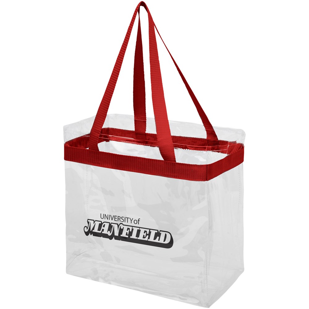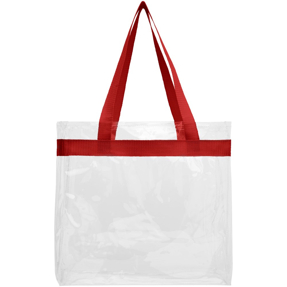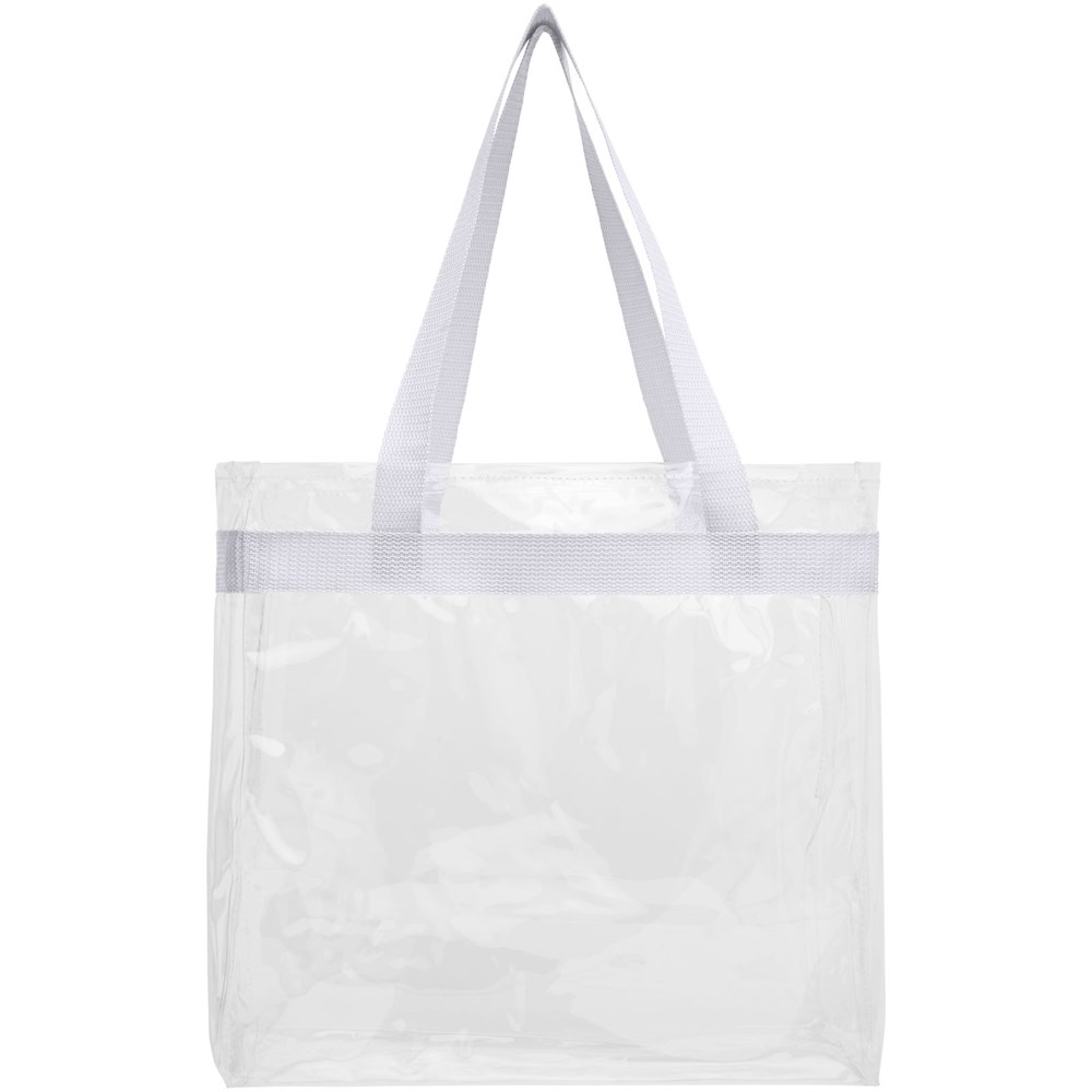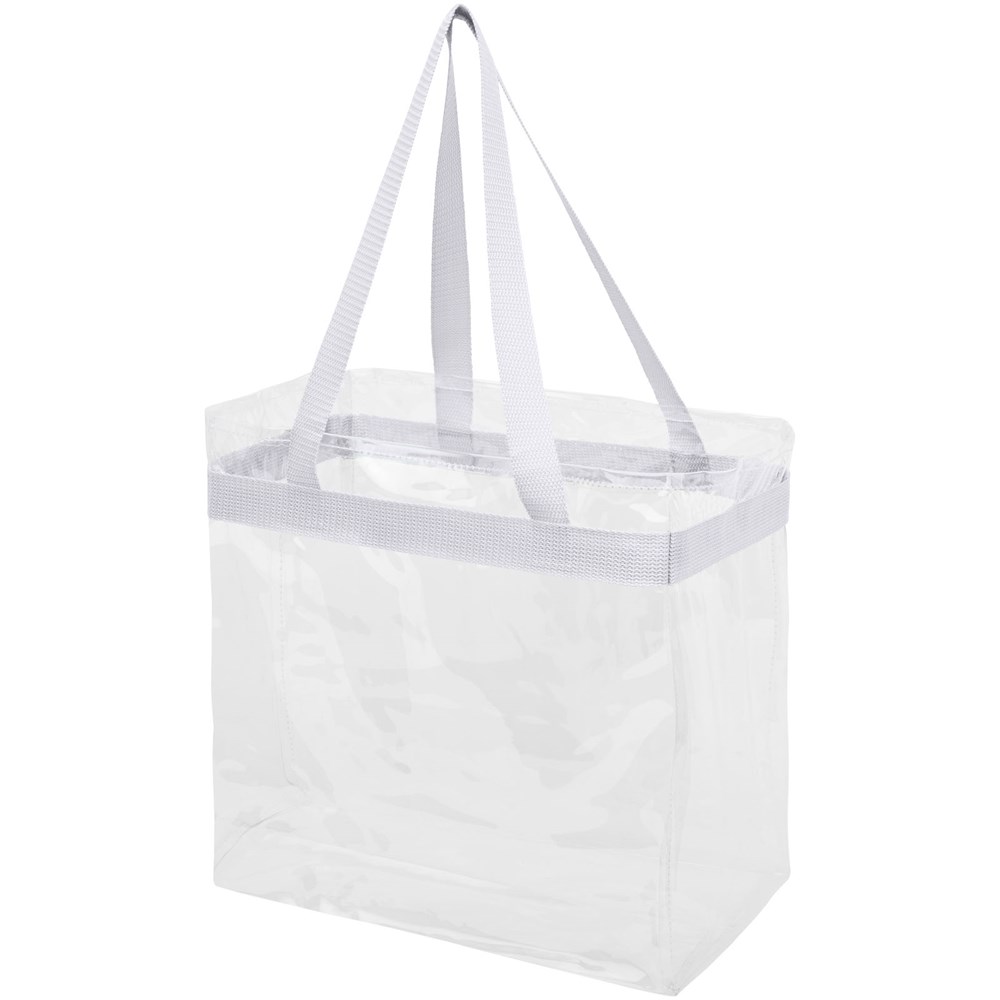 Transparante draagtas, perfect voor een middag in het stadion, een dagje op een festival of gewoon voor werk of school. Open hoofdvak met sportieve gaasrand en dubbele hengsels. Draaghoogte 27 cm. Accessoires niet inbegrepen.