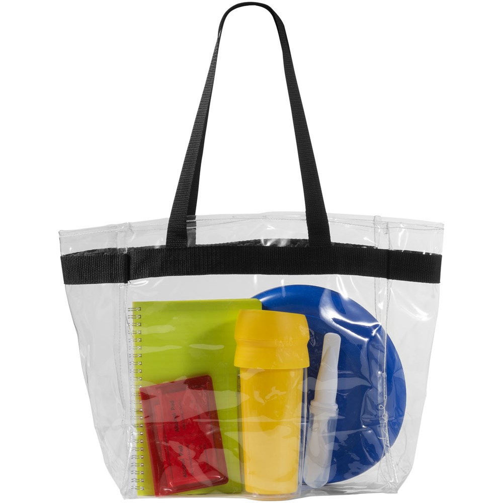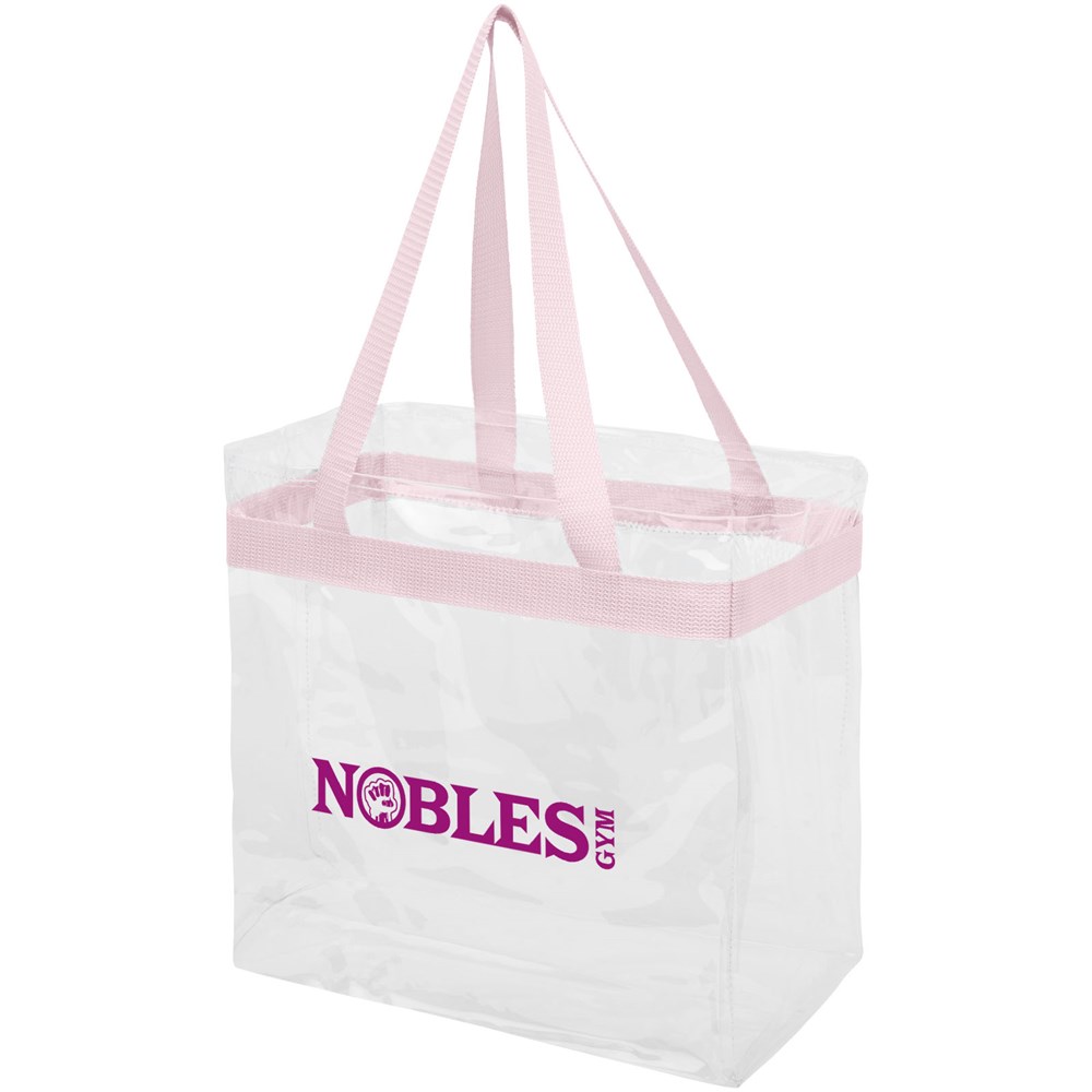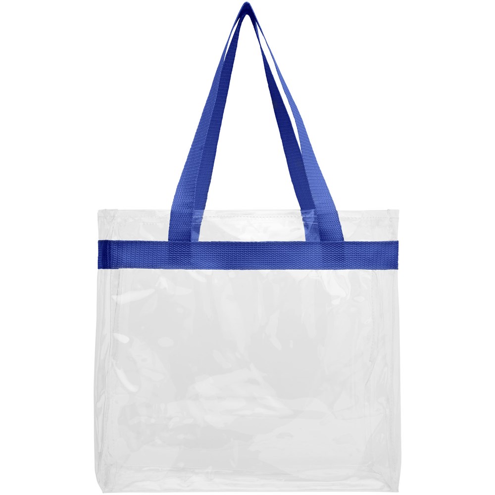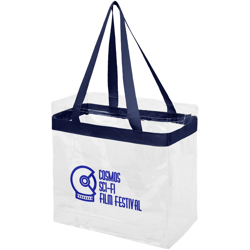 Transparante draagtas, perfect voor een middag in het stadion, een dagje op een festival of gewoon voor werk of school. Open hoofdvak met sportieve gaasrand en dubbele hengsels. Draaghoogte 27 cm. Accessoires niet inbegrepen.