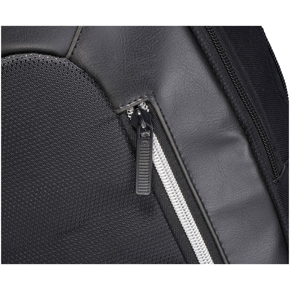 Vault RFID 15.6" laptop rugzak. Strakke, moderne 15.6 "laptop rugzak met een grote voorzijde rits met sleutelhangerhouder. Een verborgen RFID-technologie beschermt je bankpassen en paspoort tegen identiteitsfraude. Het grote gevoerde hoofdvak biedt plaats voor een 15.6" laptop en een apart gevoerd vak voor iPad of tablet. De voorste verticale rits is ontworpen om snel toegang tot het voorvak tegeven. 2 extra zijvakken voor extra opslagruimte en de verstelbare gevoerde schouderbanden met singels details zijn comfortabel. Het handvat en een trolleyband maakt het reizen makkelijk. 600D polyester.