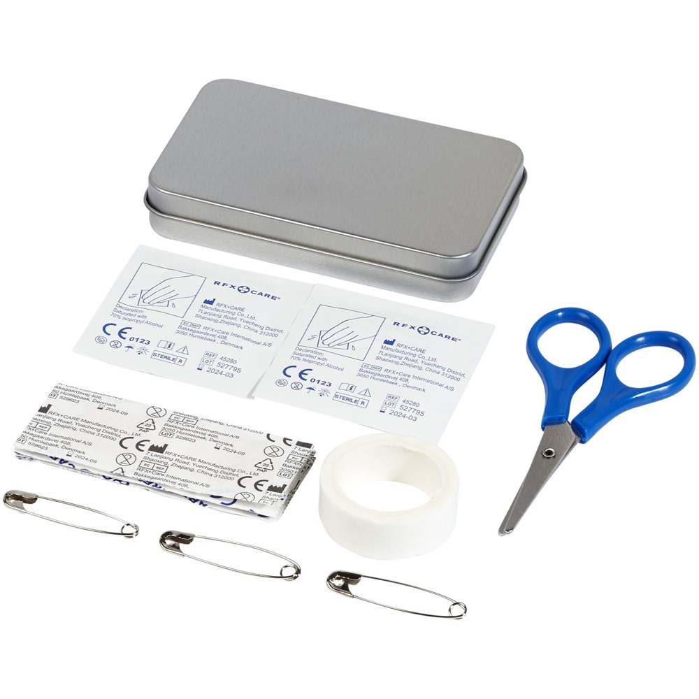 Een handige tinnen doos met vouwdeksel met 12 EHBO-benodigdheden. Zeer geschikt voor thuis, in de auto of op het werk, en met een groot decoratievlak op het deksel. Een EHBO-koffer wordt beschouwd als een medisch hulpmiddel en is onderworpen aan 93/42/EEG, op basis van het beoogde gebruik: "diagnose, preventie, controle, behandeling of verlichting van ziekte". Dit medisch hulpmiddel is van KLASSE I, Is.