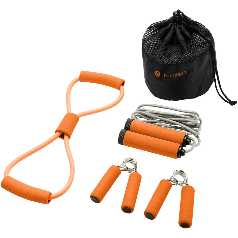Fitnessset met alle nodige hulpmiddelen voor een perfecte training. Twee handgreeptrainers, springtouw en strektoestel in bijpassend kleurmateriaal. Wordt geleverd in een gaaszakje voor gemakkelijk vervoer en heeft een groot decoratievlak.