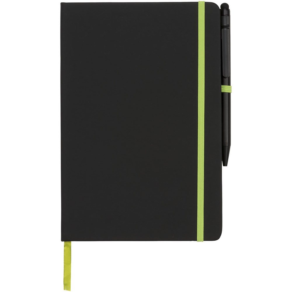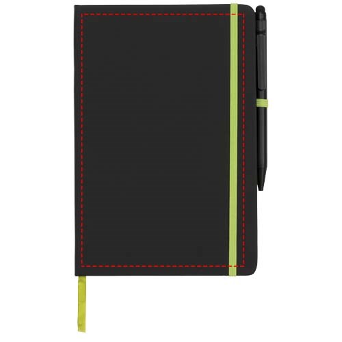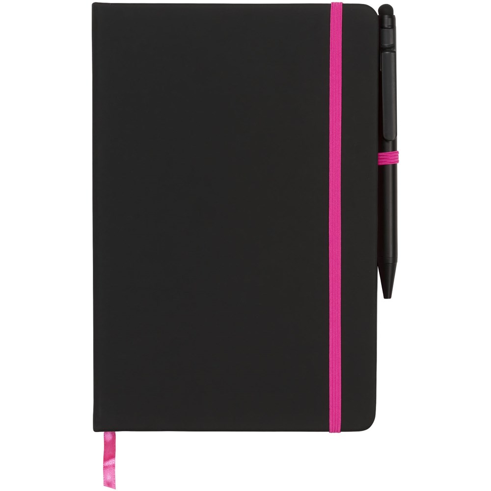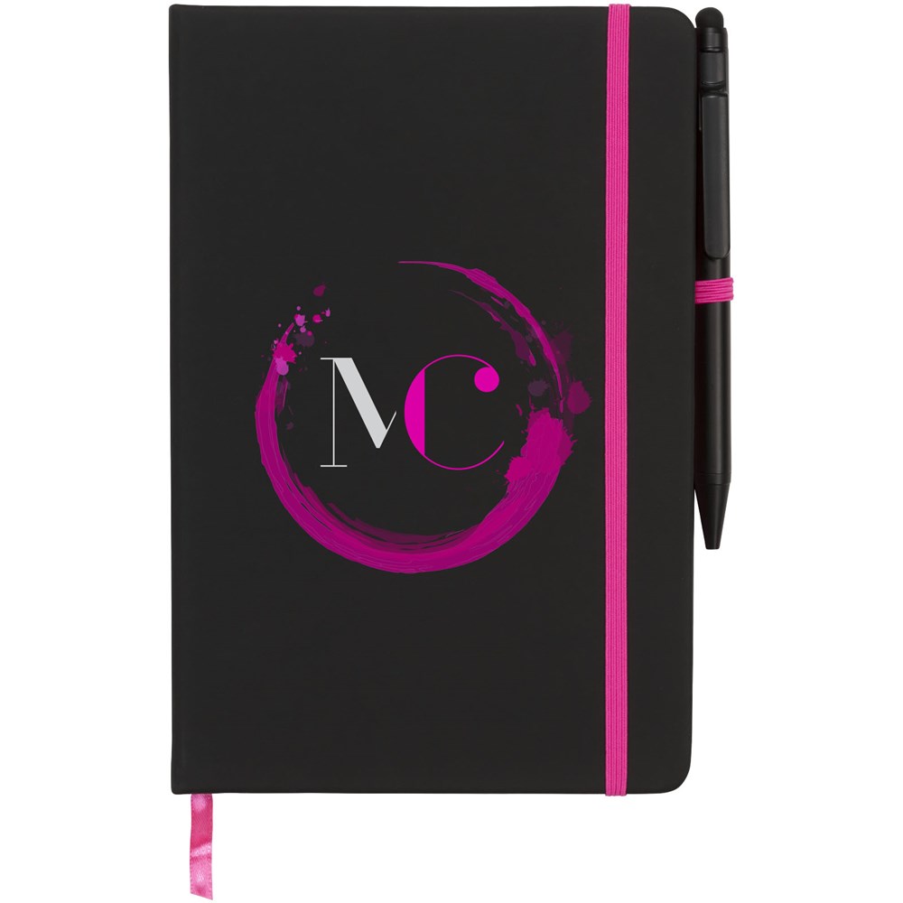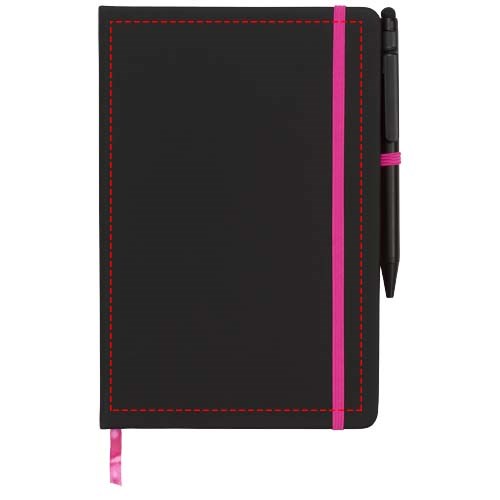 Modern en stijlvol A5-formaat zwart notitieboek met harde kaft en zacht aanvoelend materiaal. Beschikt over gekleurde paginaranden en een bijpassende pagina-lint in kleur, elastische sluiting en penlus voor een coherente look. De kleurdetails in combinatie met een digitale kleurenprint bieden een perfecte optie om de branding van de klant op de notitieboek extra te benadrukken. Daarnaast biedt de Noir-rand, vanwege de structuur van het materiaal, ook de optie voor een mooie debossing als decoratie. Inclusief 96 pagina’s (70 g / m2) crèmekleurig papier en wordt geleverd met een gratis stylus balpen. De Noir-rand is ook verkrijgbaar in een A6-formaat.