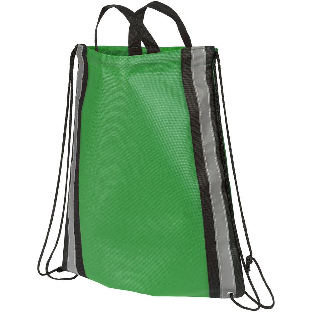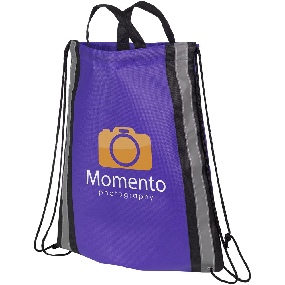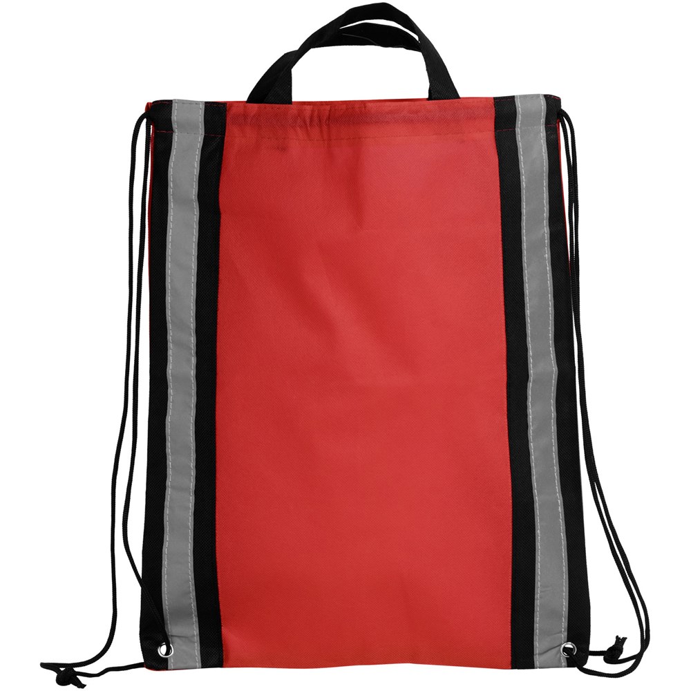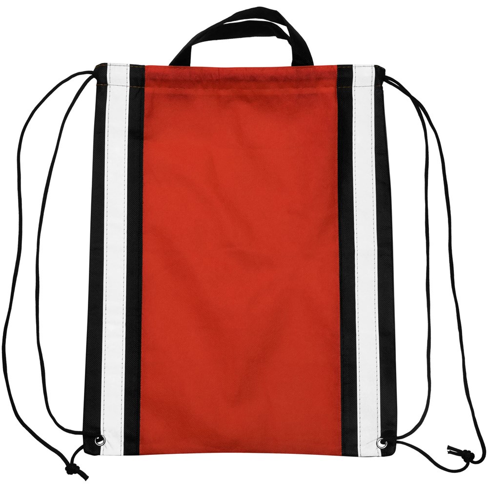 Deze non woven PP tas met trekkoord heeft reflecterende stroken aan beide kanten, ideaal om je merk extra zichtbaarheid te geven.