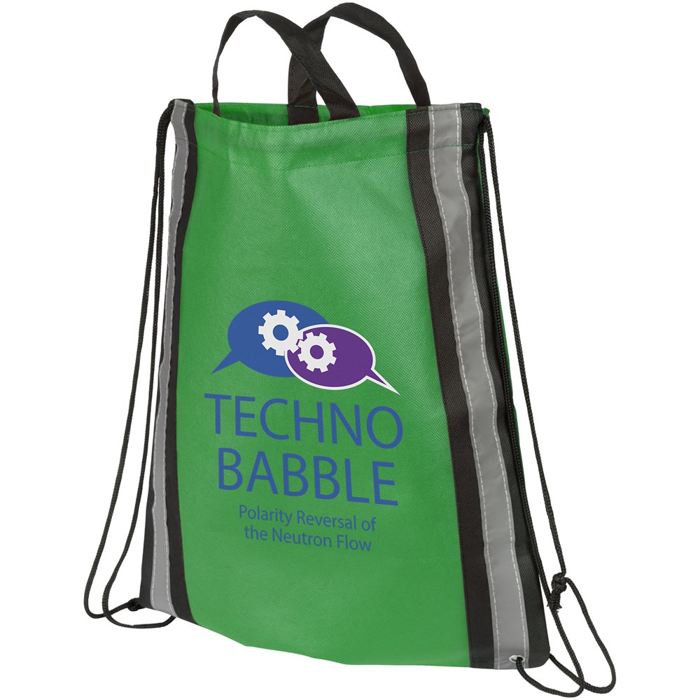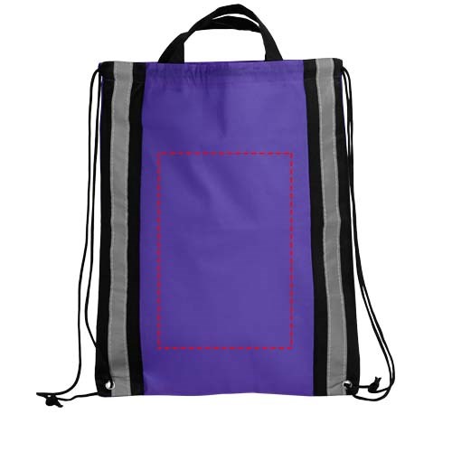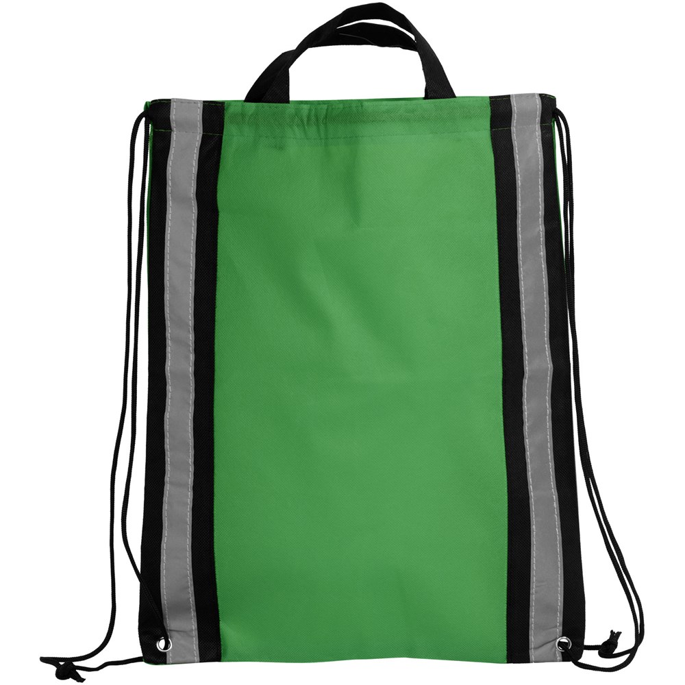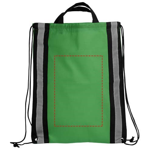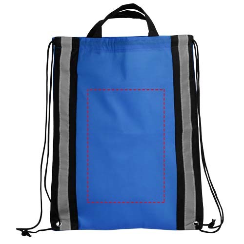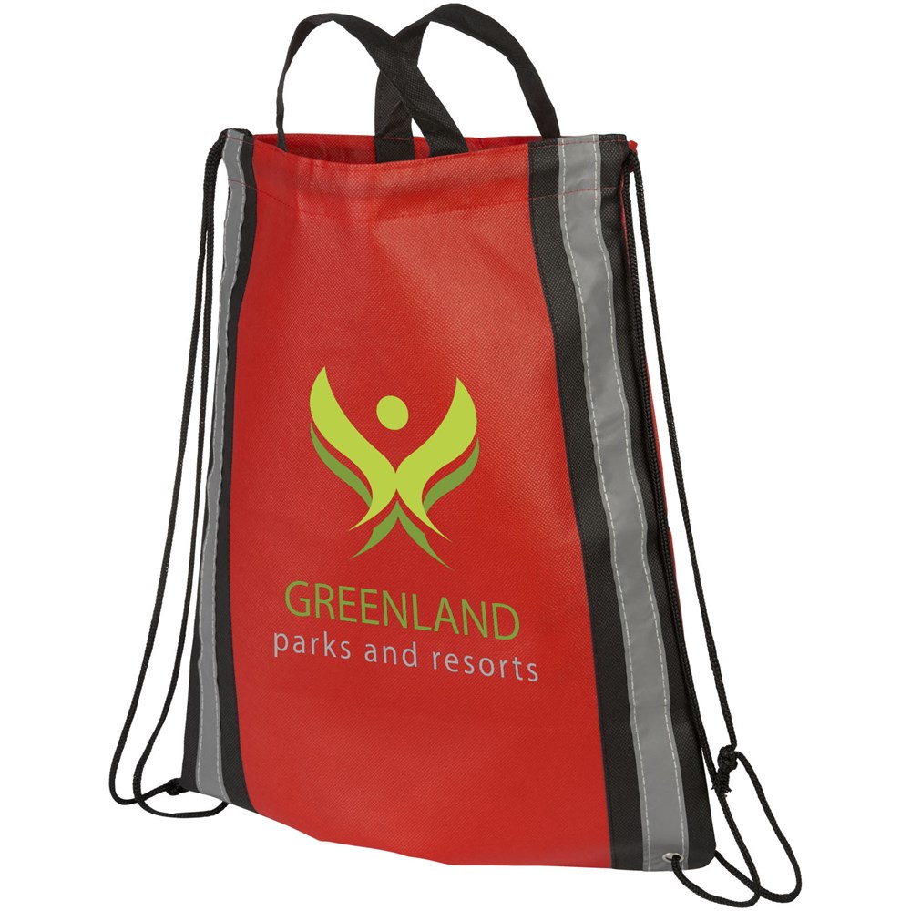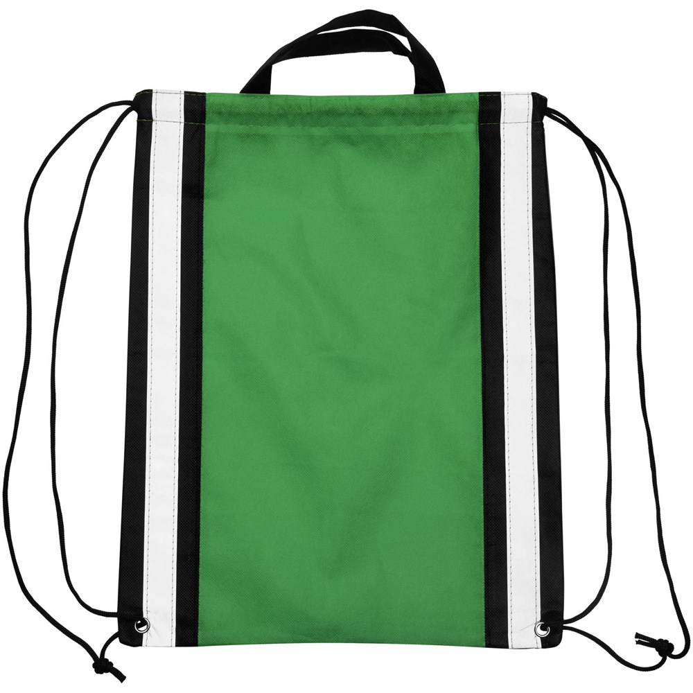Deze non woven PP tas met trekkoord heeft reflecterende stroken aan beide kanten, ideaal om je merk extra zichtbaarheid te geven.