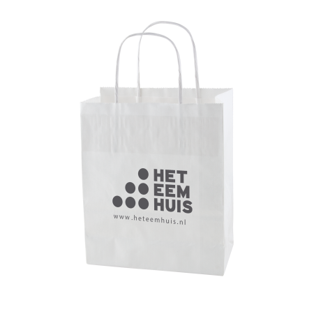 Papieren tas 320x410x120 mm in wit en bruin met gedraaide hengsels in kleur van de tas. 100 gr/m2