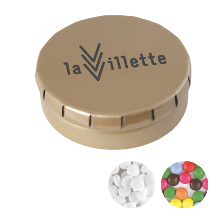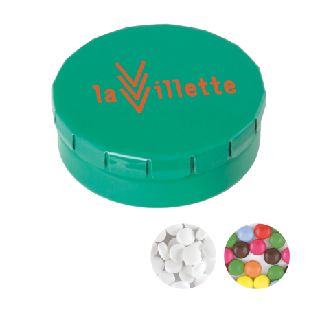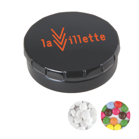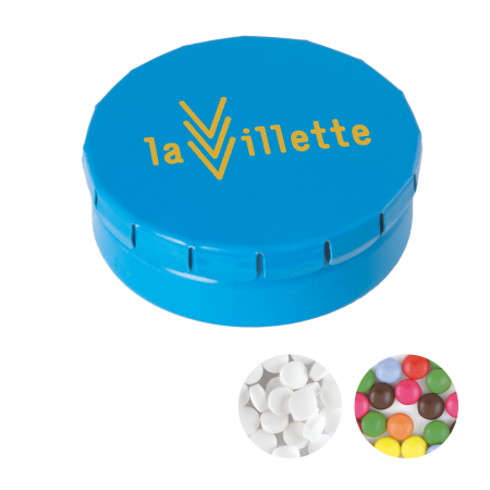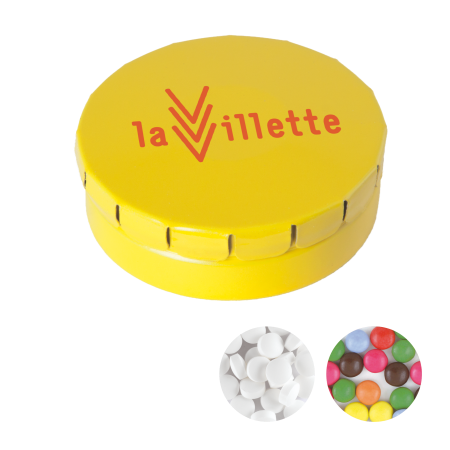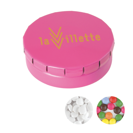 Rond click clack blik Ø 45 mm x 15 mm met ca. 12 gr. mintjes TAMPONDRUK, compleet metalen blikje, te bestellen in een groot scala aan kleuren en te vullen met diverse vullingen: mintjes, extra sterke mintjes of choco carletties.