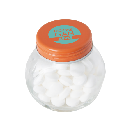 Kleine glazen pot gevuld met ca. 40 gr. mints gekleurd deksel, 53x35x55 mm, met bedrukking op dekseltje.