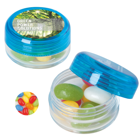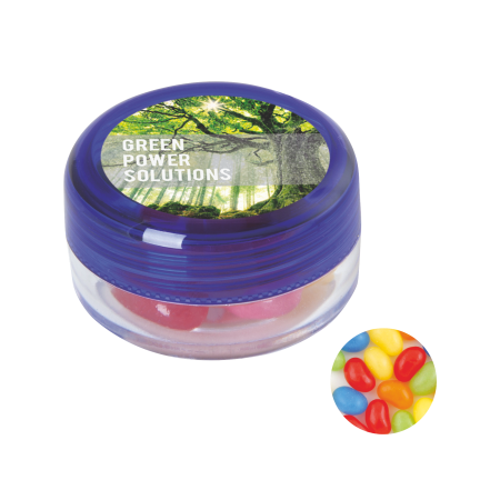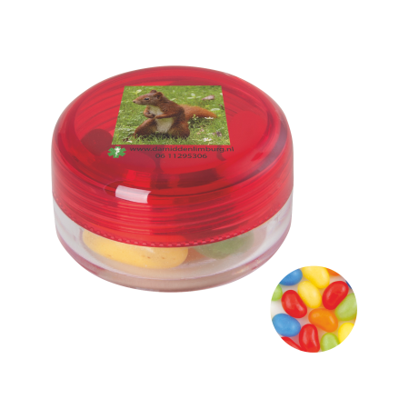 Kunststof rond potje, ø 45 x 25 mm. gekleurd deksel met ca. 12 gr. jelly beans.