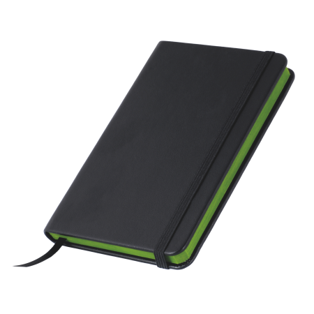 Notitieboekje A6 zwart met elastiek en leeslint zwart en kleuropsnede, 60 pagina`s, leverbaar in de kleuren: donkerblauw, lichtgroen, geel, oranje en rood.