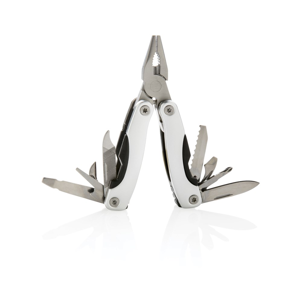 13 functies, roestvrijstalen multitool met geanodiseerd aluminium handvat, verpakt in etui.