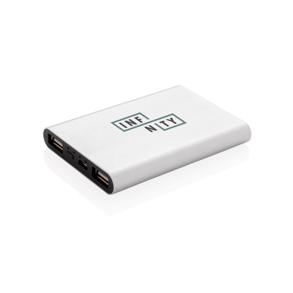 Ultra platte 5.000 mAh powerbank gemaakt van aluminium die zo perfect in je zak past dat u hem overal mee naar toe kunt nemen. Als deze volledig is opgeladen, beschikt u over voldoende energie om uw mobiele telefoon tot drie keer op te laden. De powerbank bevat een 5.000 mAh grade-A high density lithiumpolymeerbatterij met een lange levensduur. De lichtindicatoren geven het resterende energieniveau aan, zodat u altijd weet wanneer u het apparaat opnieuw moet opladen. Input 5V/1.5A. Output 5V/2.1A.