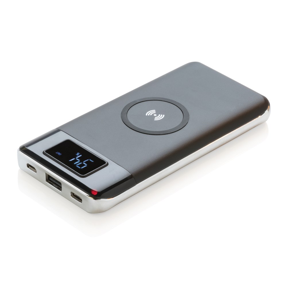 Deze powerbank gebruikt grensverleggende technologieen op het gebied van laden: USB type C; draadloos laden en een kwalitatief hoogwaardig digitaal scherm om exacte vermogen weer te geven. De powerbank heeft een 10.000 mAh lithium batterij die opgeladen kan worden via micro USB en ook via een USB type C poort. In het midden van de powerbank bevindt zich een 5W draadloze lader om je telefoon op te laden. Draadloos opladen compatibel met alle QI-apparaten zoals Android nieuwste generatie, iPhone 8 en hoger. Input: 5V/ 2A. Draadloze output: 5V/2.1A; 5W. Input type C: 5V/3A Output type C: 5V/3A.