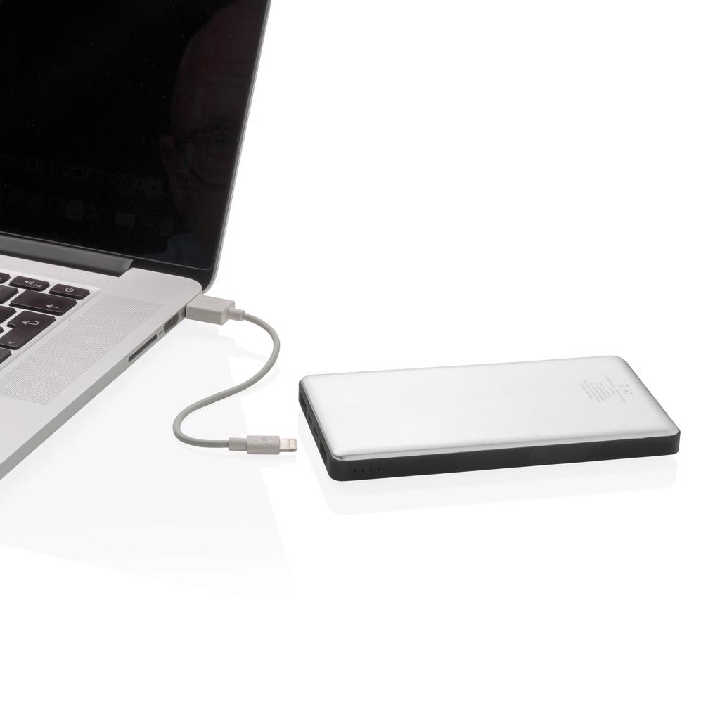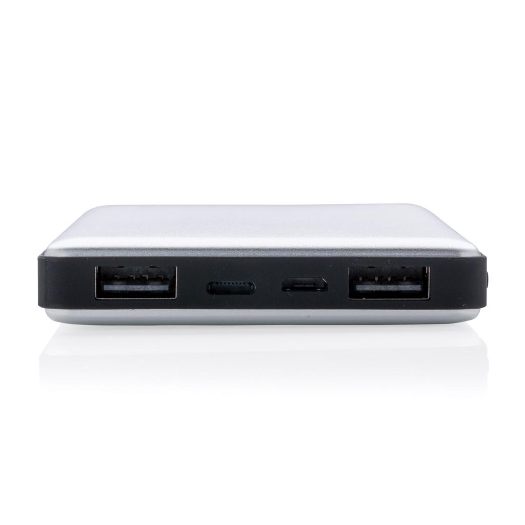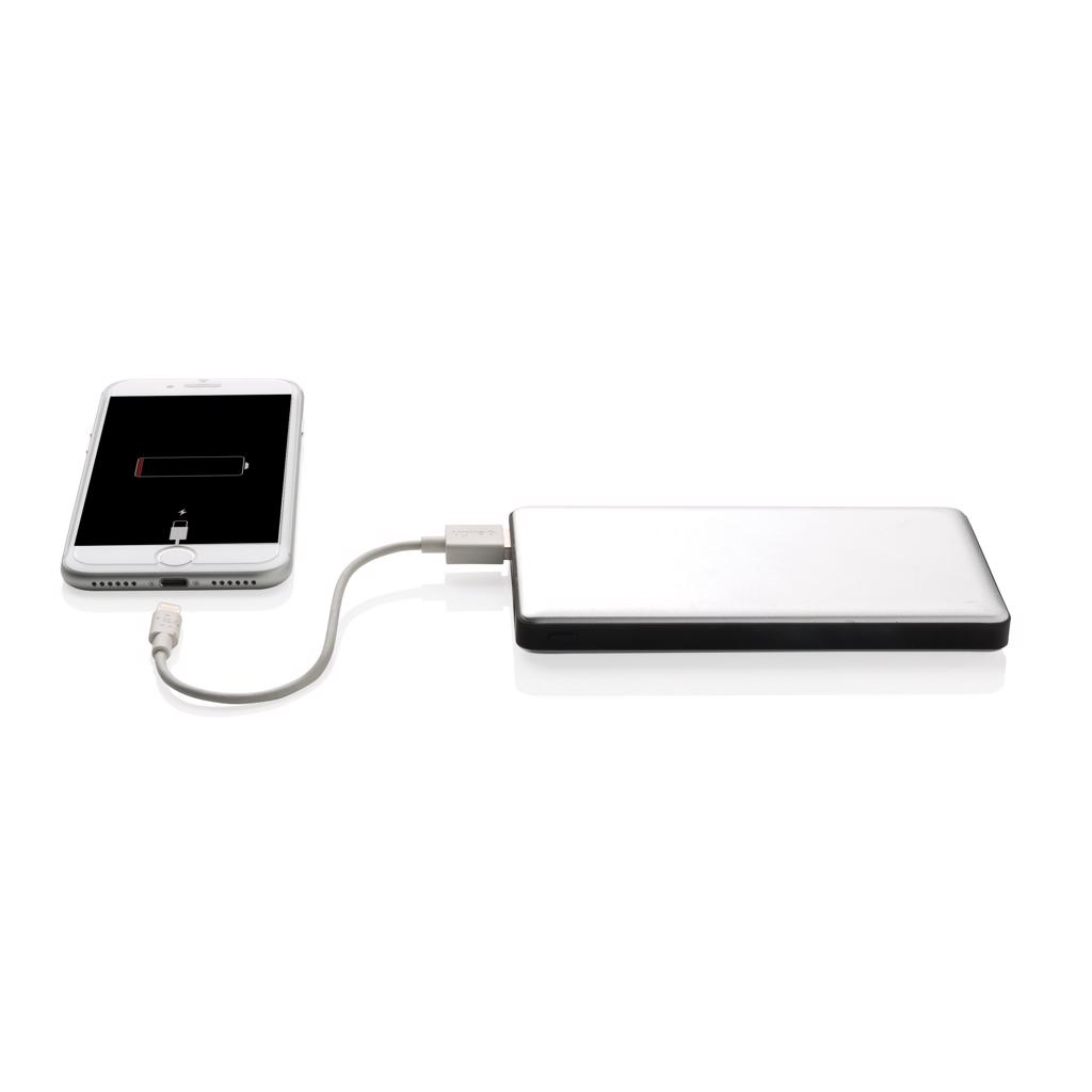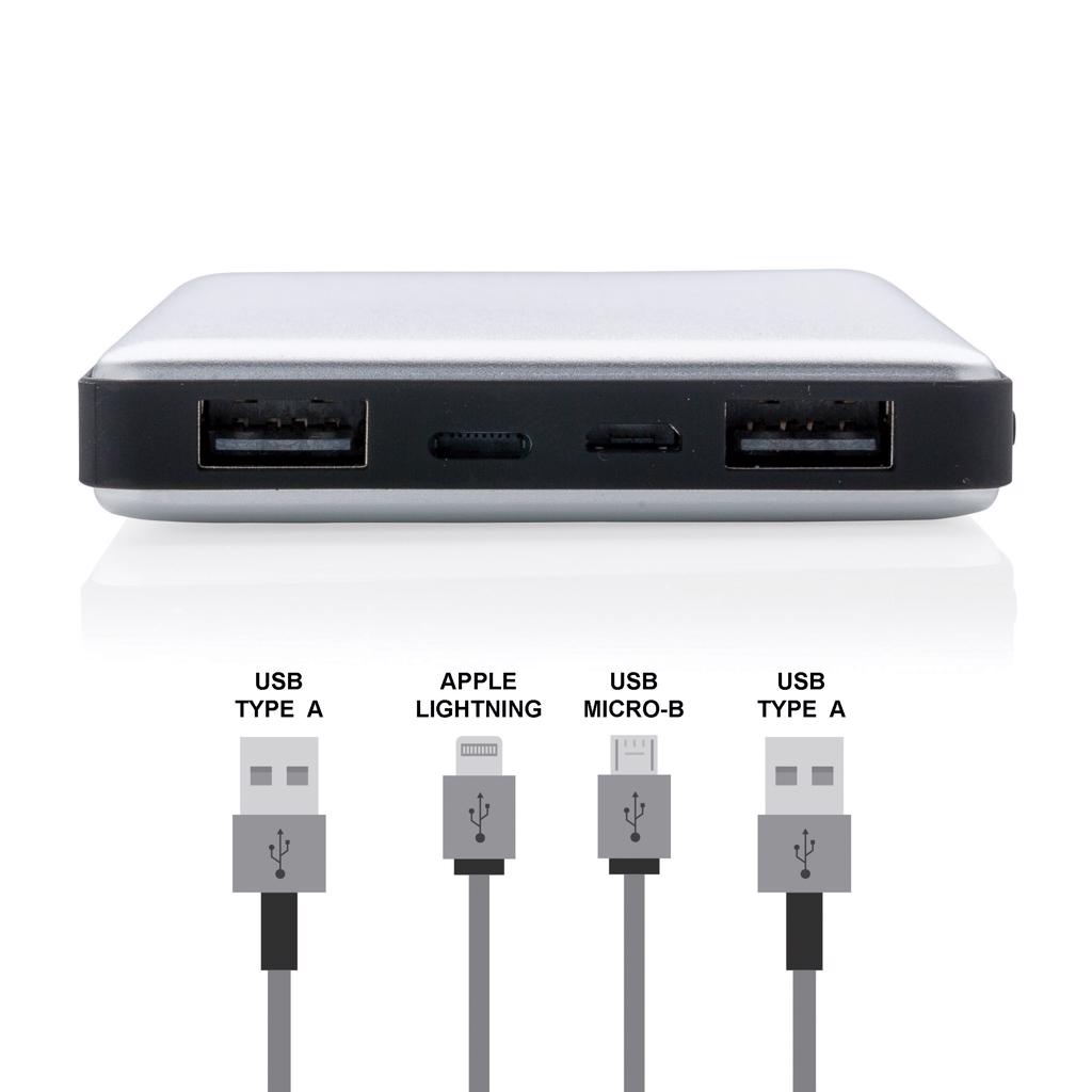 Aluminium powerbank met 10.000 mAh lithium poly batterij. De powerbank heeft twee output poorten en twee input poorten die de gebruiker de keuze biedt om te laden via micro USB of Apple lightning. Erg handig voor iOS gebruikers die met dezelfde kabel (niet inbegrepen) zowel de telefoon als de powerbank kunnen laden. De powerbank is geschikt voor het laden van zowel tablets als telefoons. Met energielevel-indicator om de resterende energie weer te geven. Output: DC 5V/2.4A input: 5V/2A.
