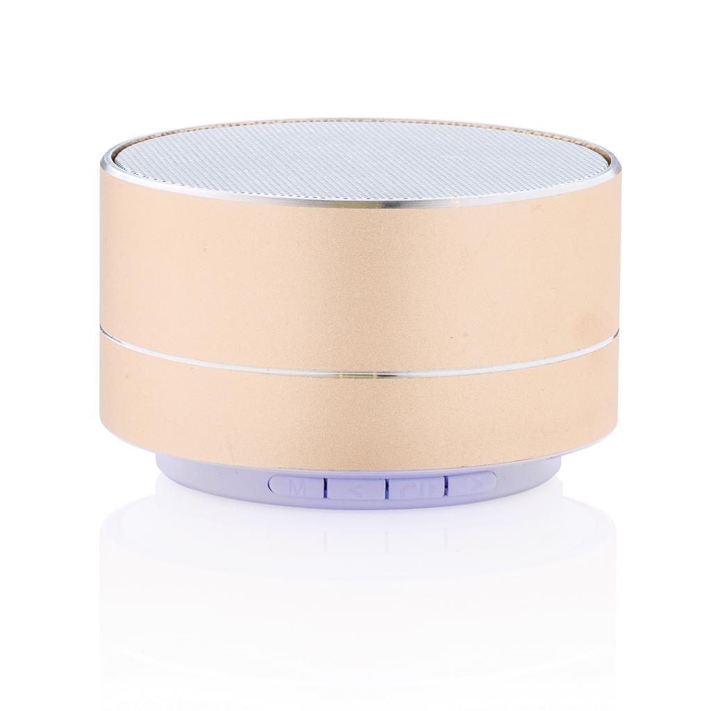 Aluminium 3W luidspreker ‘Beats-Bass-Music’ met ingebouwde 300 mAh lithiumbatterij. Met één keer opladen kunt u de speaker 4 uur gebruiken. De speaker heeft een bereik van 10 meter, blauwe verlichting aan de onderrand en een pick-up functie om inkomende gesprekken te beantwoorden.