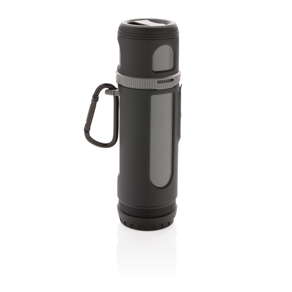 Unieke 4-in-1 outdoor tool met powerbank, draadloze speaker, camping lamp en zaklamp. De 3W speaker heeft een speelduur van 18 uur op een volle batterij.De powerbank heeft een capaciteit van 4400 mAh en 5V/2A output en 2A input. De LED lamp is zeer krachtig (200-250 lm) en geschikt voor gebruik buiten. De zaklamp heeft 4 standen (normaal, sterk, soft en knipperlicht). Inclusief karabijnhaak om overal aan op te hangen.