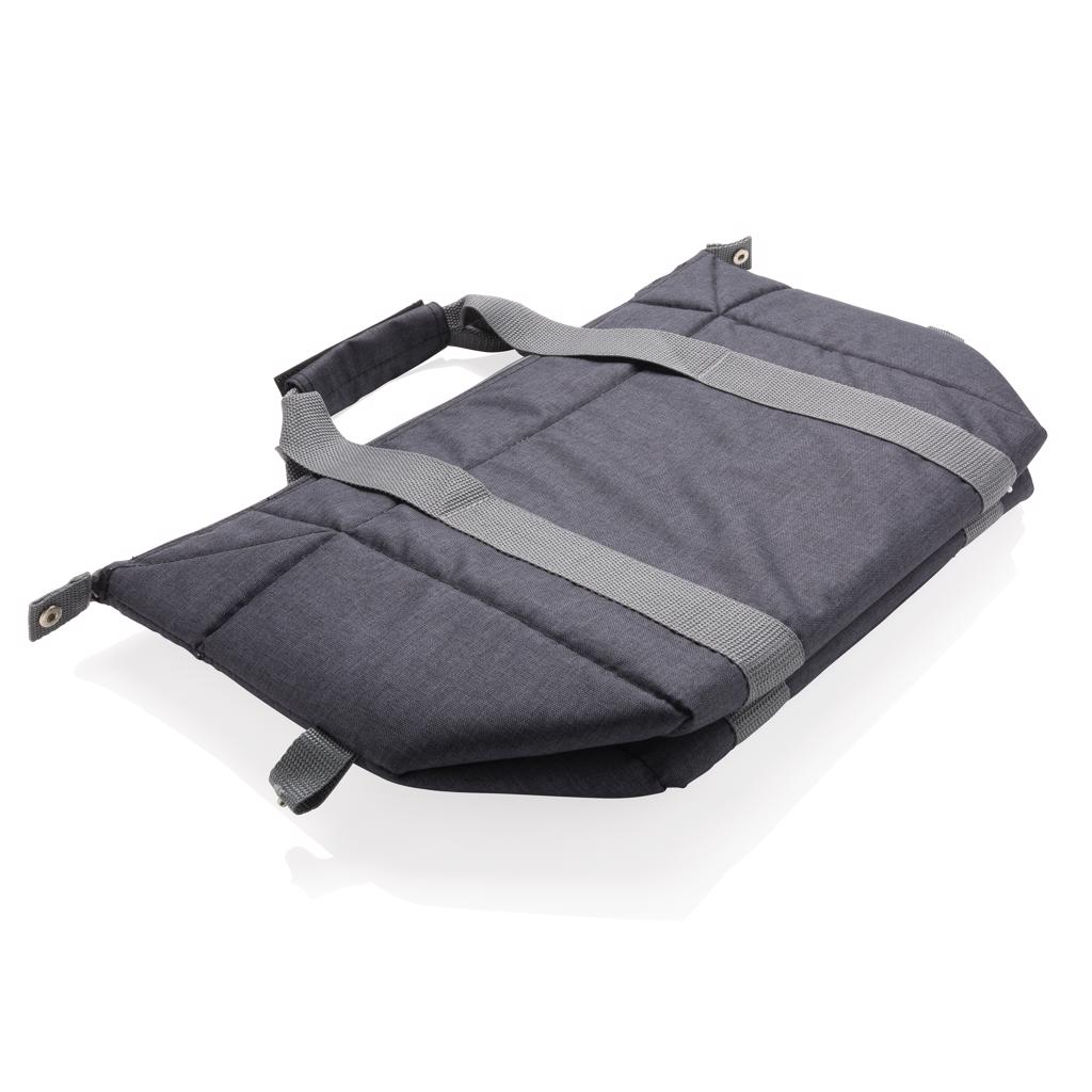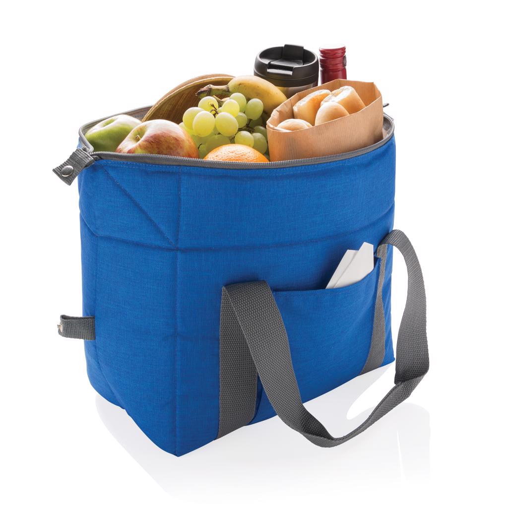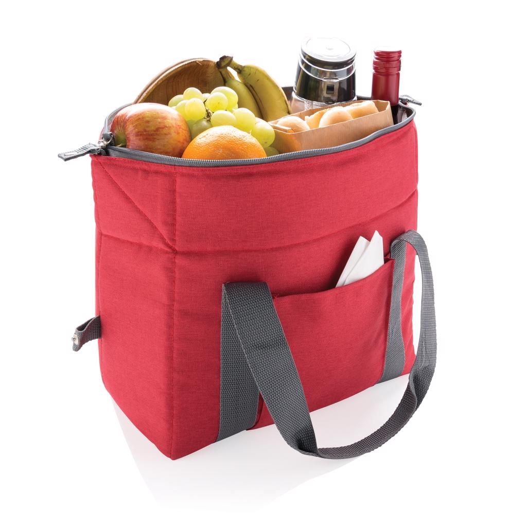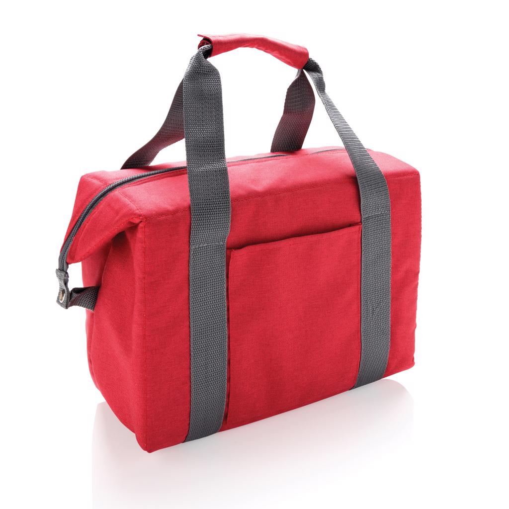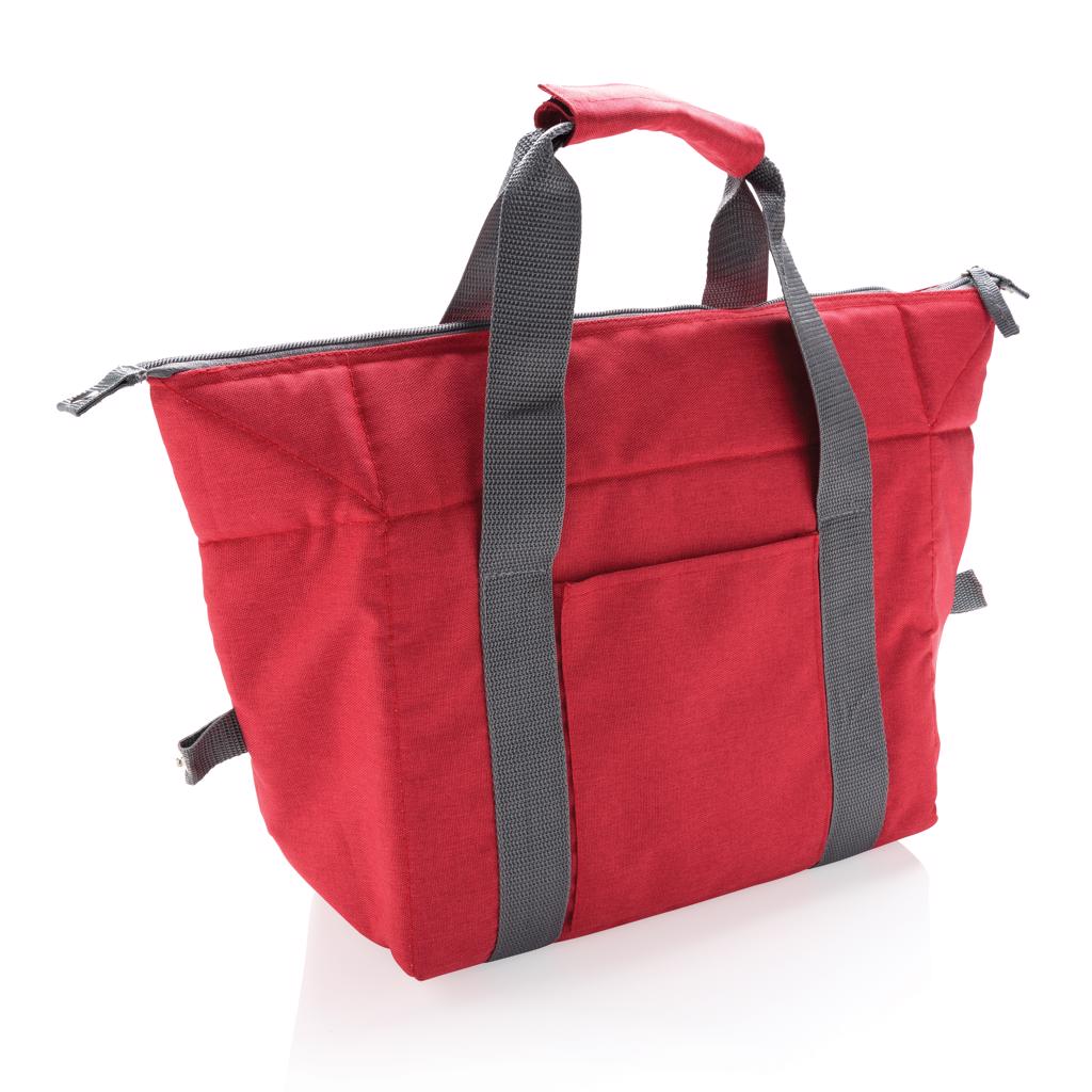 Middelgrote 600D tote koeltas. Inhoud voor maximaal 26 blikjes. Kan gemakkelijk worden omgevormd tot een duffle tas door het sluiten van de buckles aan de zijkant. Met aan de voorzijde vak.