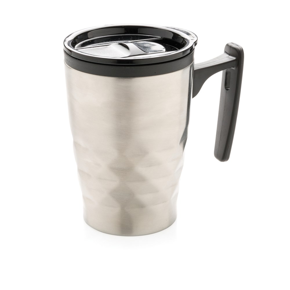 Trendy roestvrijstalen mok met handvat. Past eenvoudig onder de meeste koffiemachines. PP handvat en binnenzijde. Capaciteit 380ml.