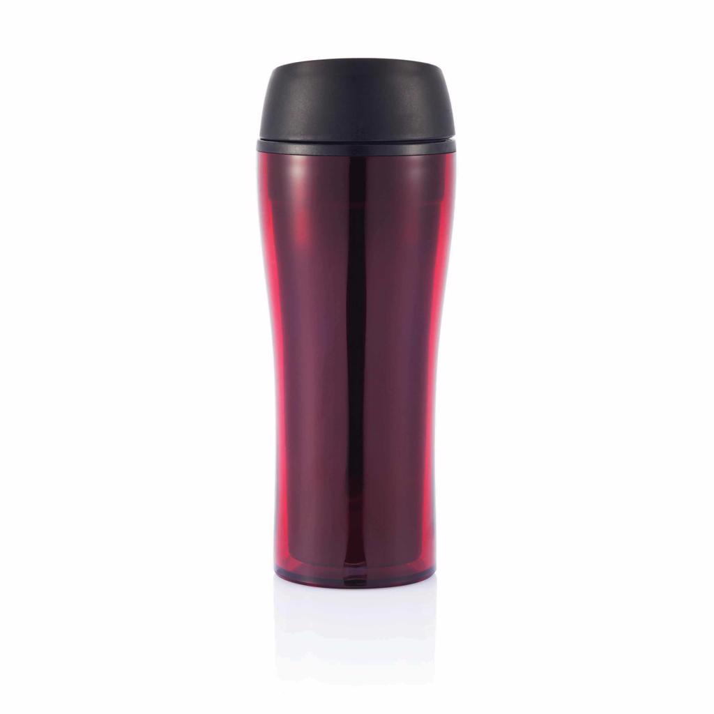 400ml dubbelwandige AS mok met lekvrije deksel en uniek druksysteem voor sluiting om met één hand te bedienen.