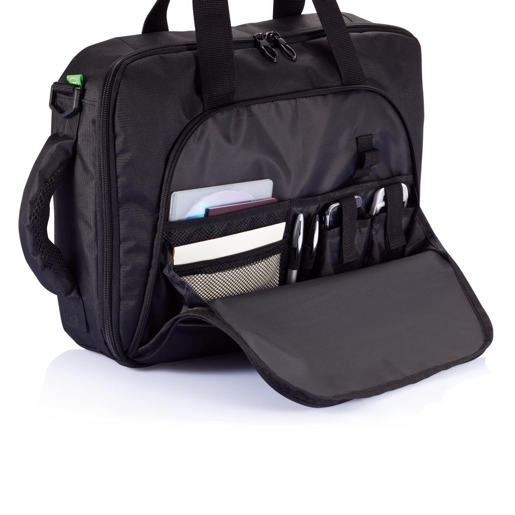 600D ribstop inclusief hoofdcompartiment met opbergvak voor 15,6” laptop, voorvak met organiser, gevoerde handvaten, schouderriem en schouderbanden.