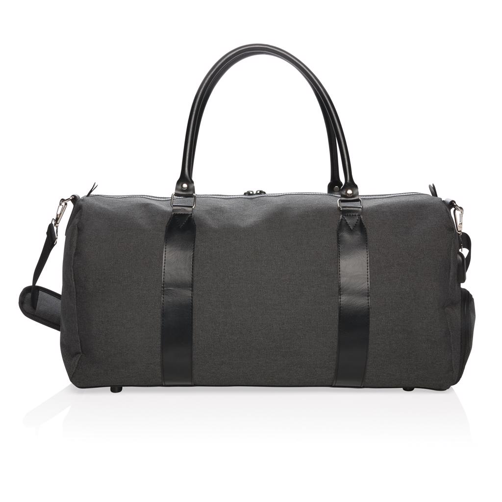 Moderne en minimalistische 600D polyester weekendtas met PU handvatten en comfortabele schouderband. Groot hoofdvak met veel ruimte voor uw sportoutfit of al uw spullen voor een weekendje weg. Laad uw telefoon of tablet onderweg eenvoudig op met de geïntegreerde USB-poort. Beschikt over een handig vak met snelle toegang aan de rechterkant. PVC-vrij.