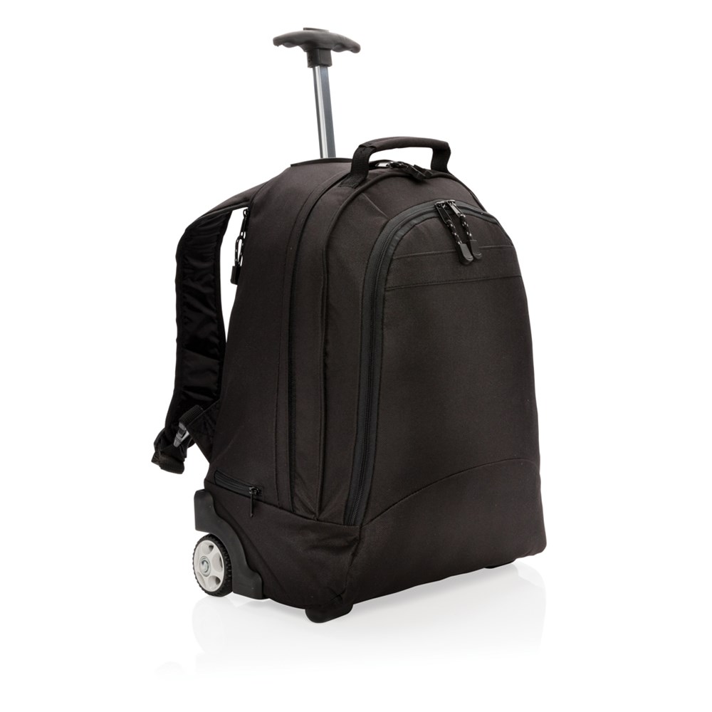 600D nylon met lichtmetalen velgen, laptop compartiment en voorvak met legio opbergmogelijkheden.