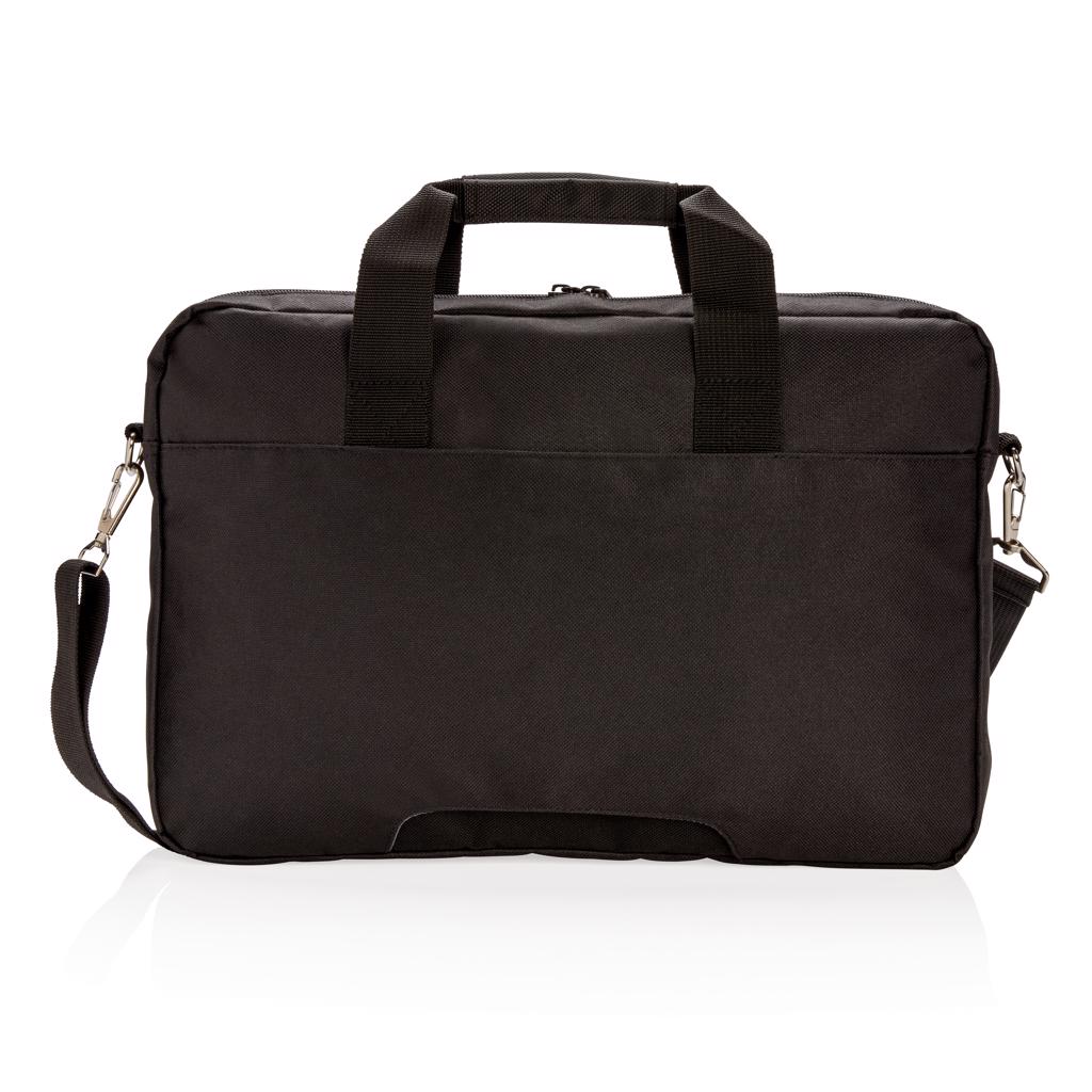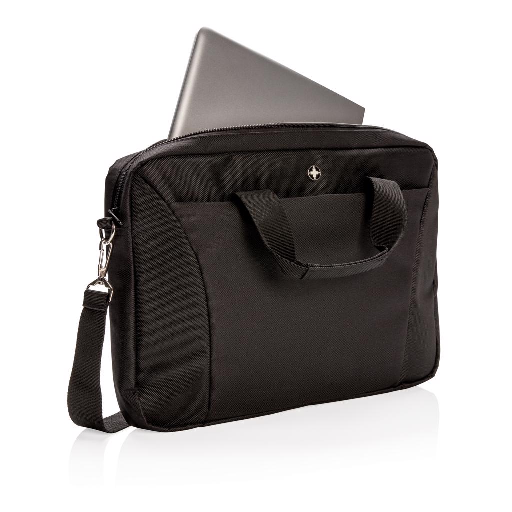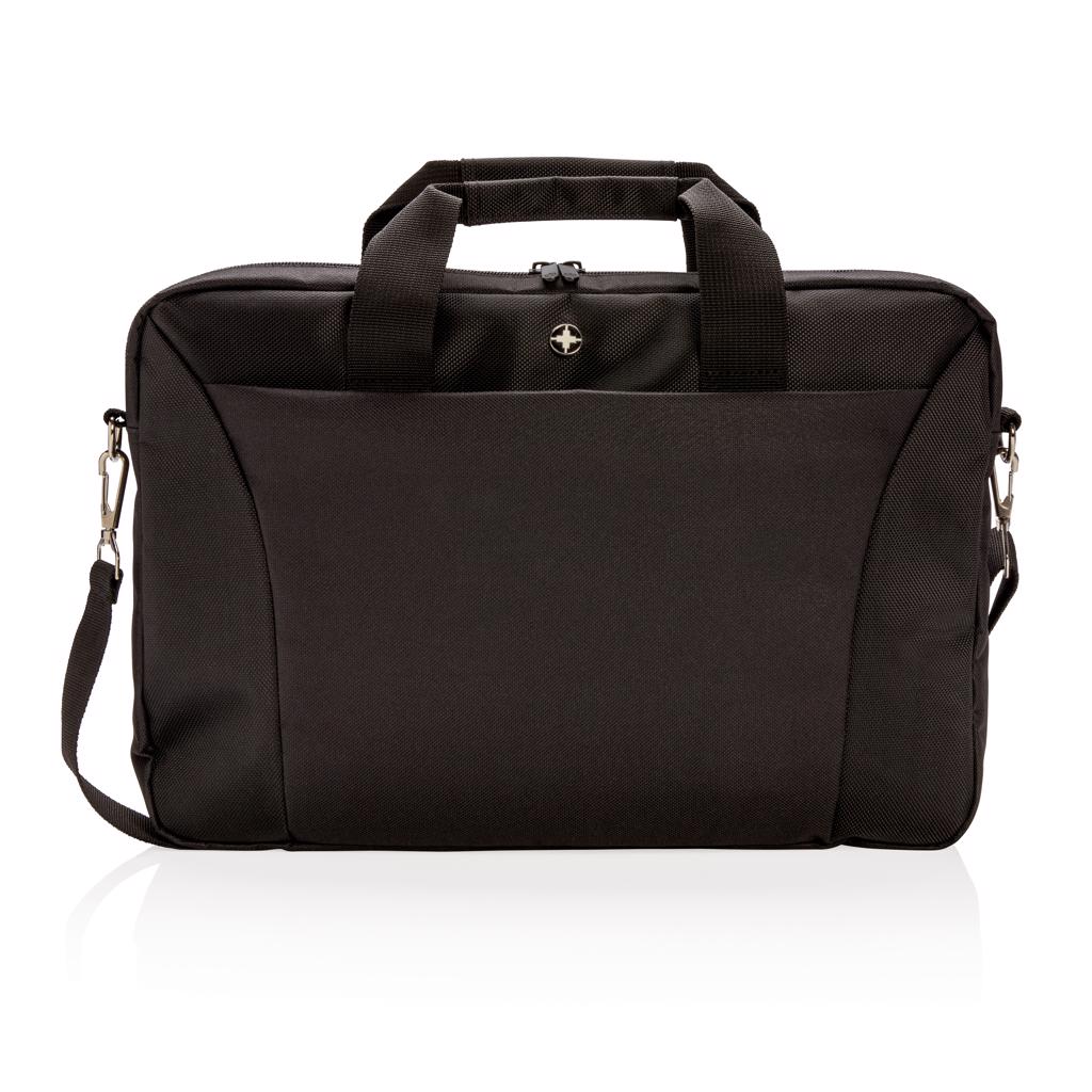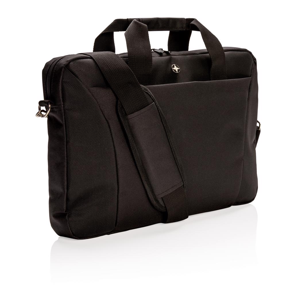 Kom goed voor de dag met deze 600D met 1680D polyester 15.4” laptop tas van Swiss Peak. Twee hoofdvakken; één gevoerd laptopvak van 15.4” zodat je laptop veilig en beschermd opgeborgen kan worden. Het andere hoofdvak kan worden gebruikt voor de iPad of tablet. Opening aan de achterzijde waarmee de tas aan de trekstang van je trolley of koffer kan worden bevestigd. PVC vrij.