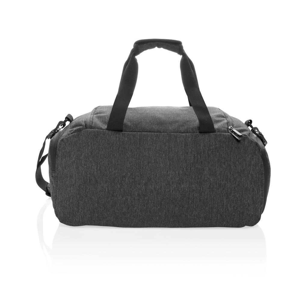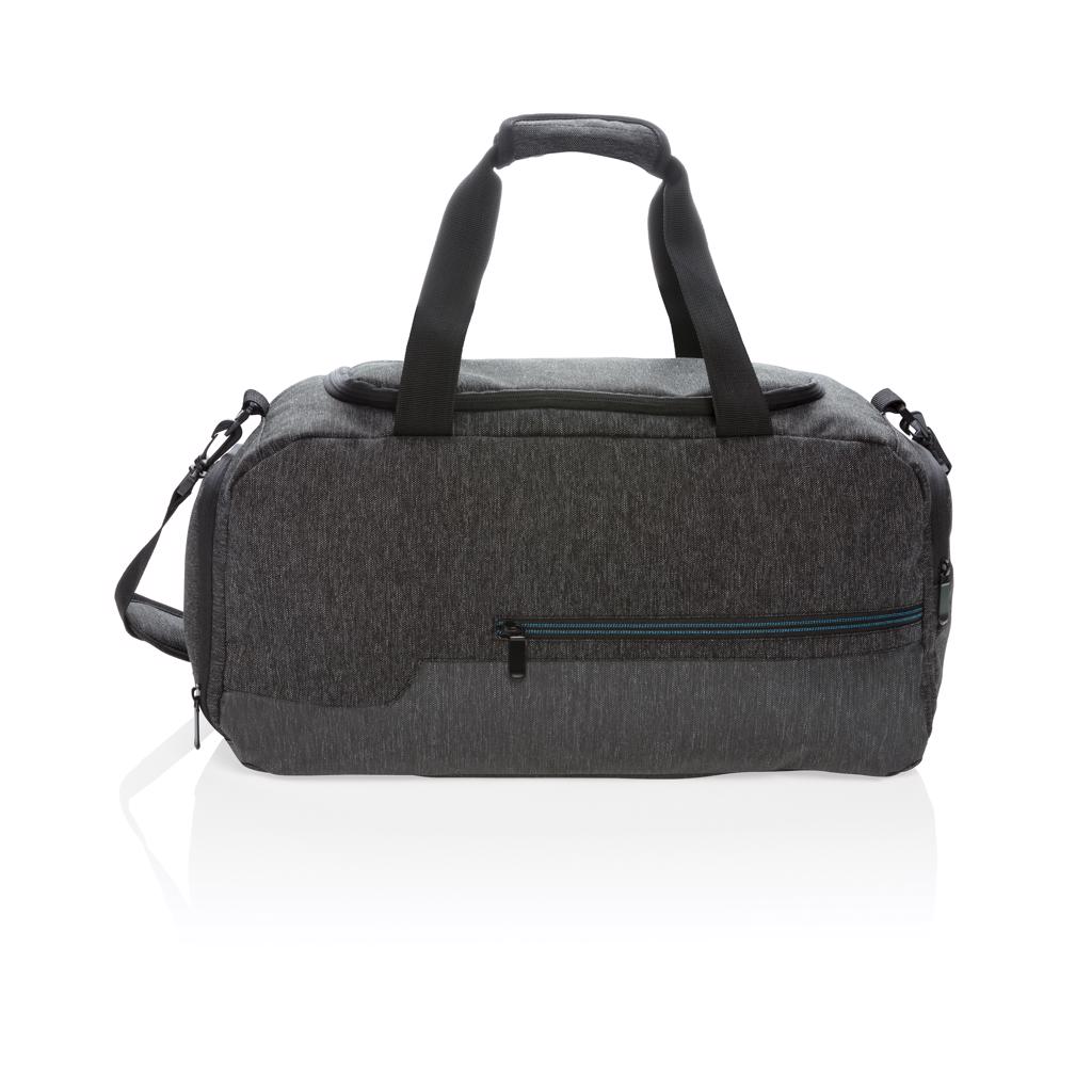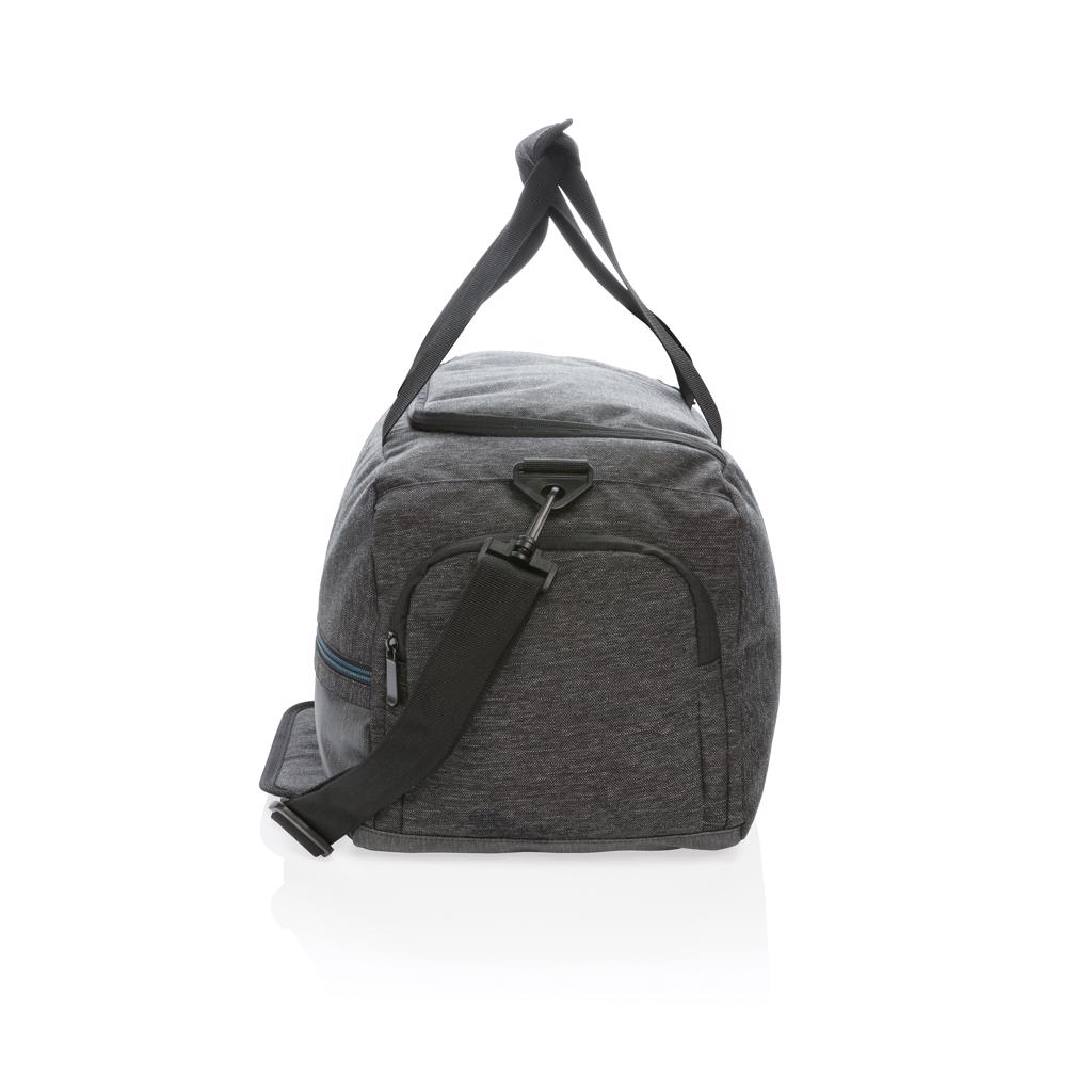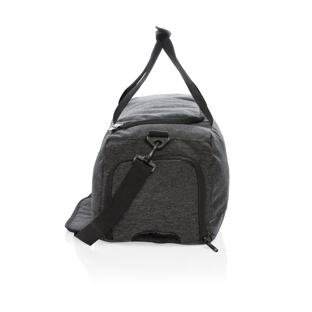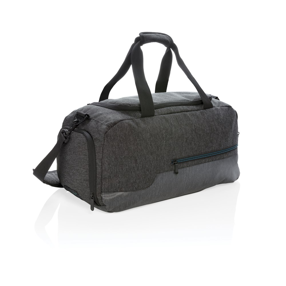 Deze comfortabele 900D reistas is perfect voor ieder actief avontuur. De tas is gemaakt van duurzaam polyester en heeft een waterbestendige coating om de tas te beschermen tegen vuile sportvloeren of natte velden. Met versterkte handvatten en een gevoerde schouderriem die op verschillende manieren gebruikt kan worden. Deze duffle beschikt over een ruim hoofdvak met een binnenvak met rits om geld of waardevolle spullen in op te bergen, een ademend zijvak voor je schoenen en een ritsvak aan de voorkant met ruimte voor uw mobiele telefoon, sleutels en andere vaak gebruikte accessoires. PVC vrij.
