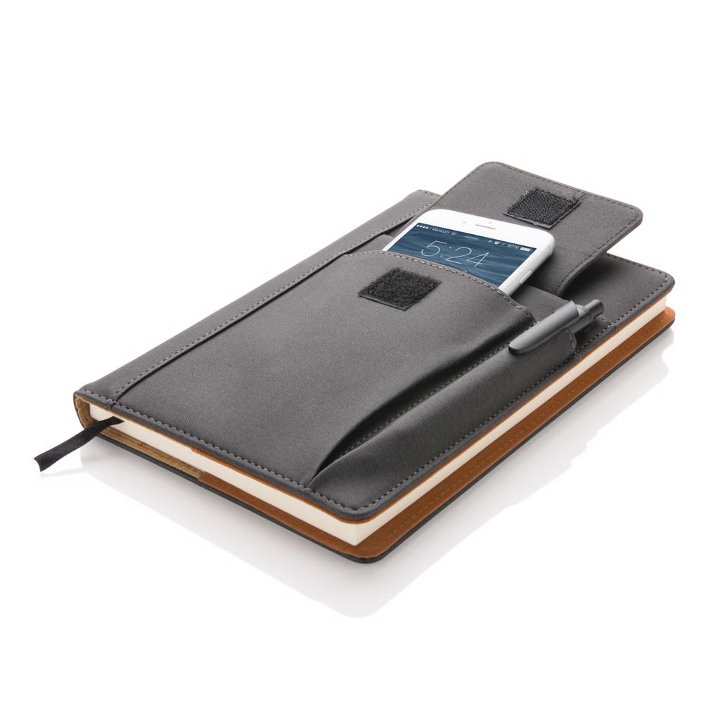 Gecoate PU omslag voor notitieboek met voorvak voor telefoon (14x10 cm.), pennenvak en hoofdcompartiment voor bijvoorbeeld een powerbank of visitekaartjes. Het notitieboek heeft een zwarte paginaverdeler en 160 pagina’s van 80g/m2 papier. U kunt het notitieboek moeiteloos vervangen, zodat u eindeloos plezier heeft van deze omslag.