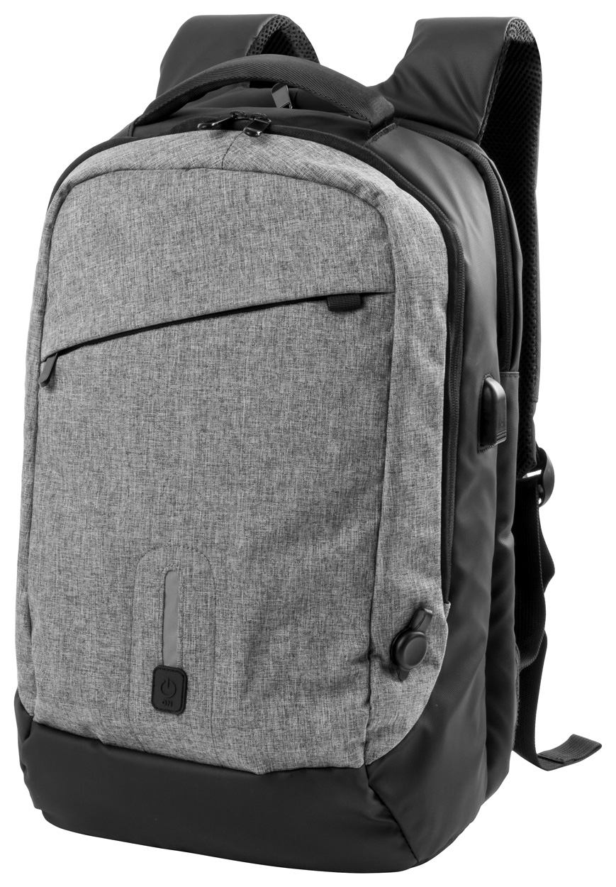 Waterdichte rugtas met compartimenten en meerdere ritsen, gewatteerde laptop- en tabletcompartimenten en gewatteerde rug- en schouderriemen. Met ingebouwde 8000 mAh powerbank, inclusief micro USB- en Type-C oplaadkabel. 600D polyester.