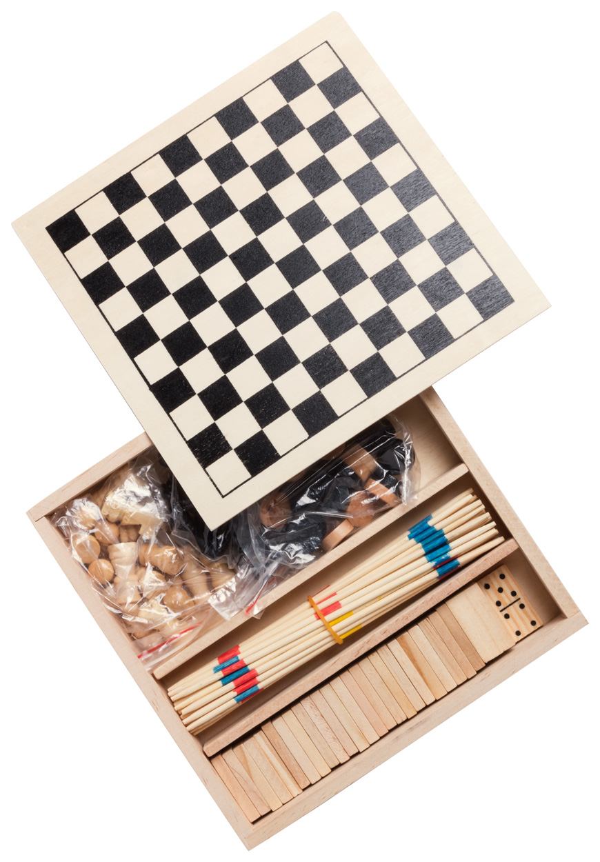 Houten spelset inclusief schaken, dominostenen, mikado en dammen.