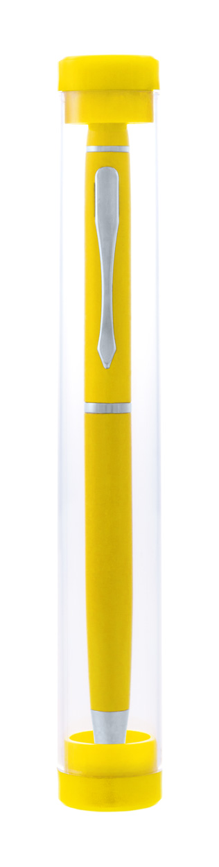 Aluminium balpen met touch screen pen, in transparante plastic hoes met bijpassend gekleurde dopjes. Blauw schrijvend.