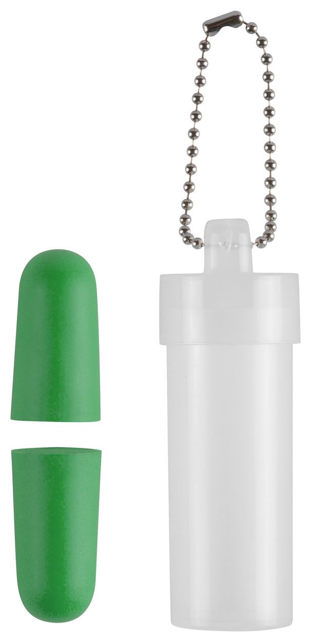 Gekleurde EVA oordopjes in transparant plastic verpakking met metalen ketting.
