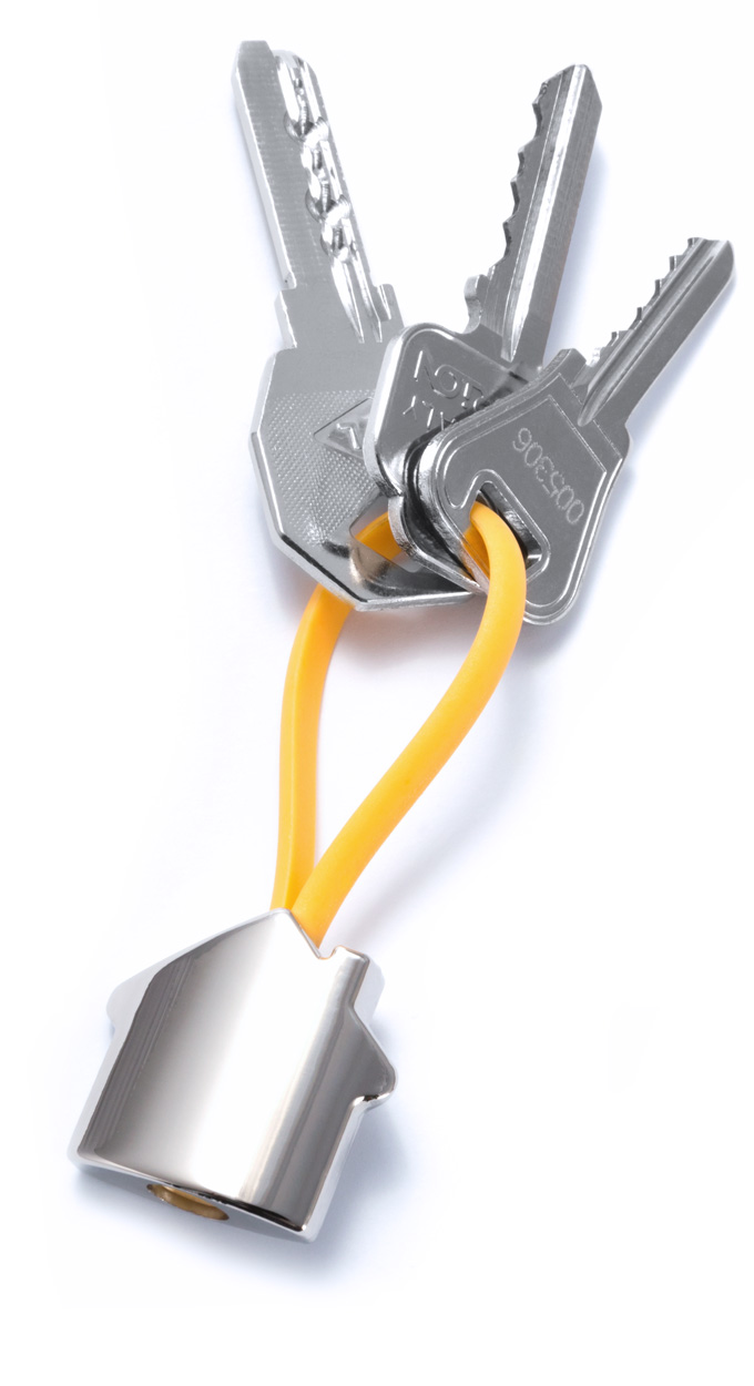 Aluminium sleutelhanger met gekleurd touw. In de vorm van een huis.