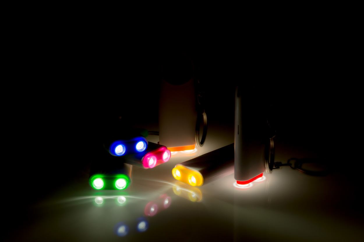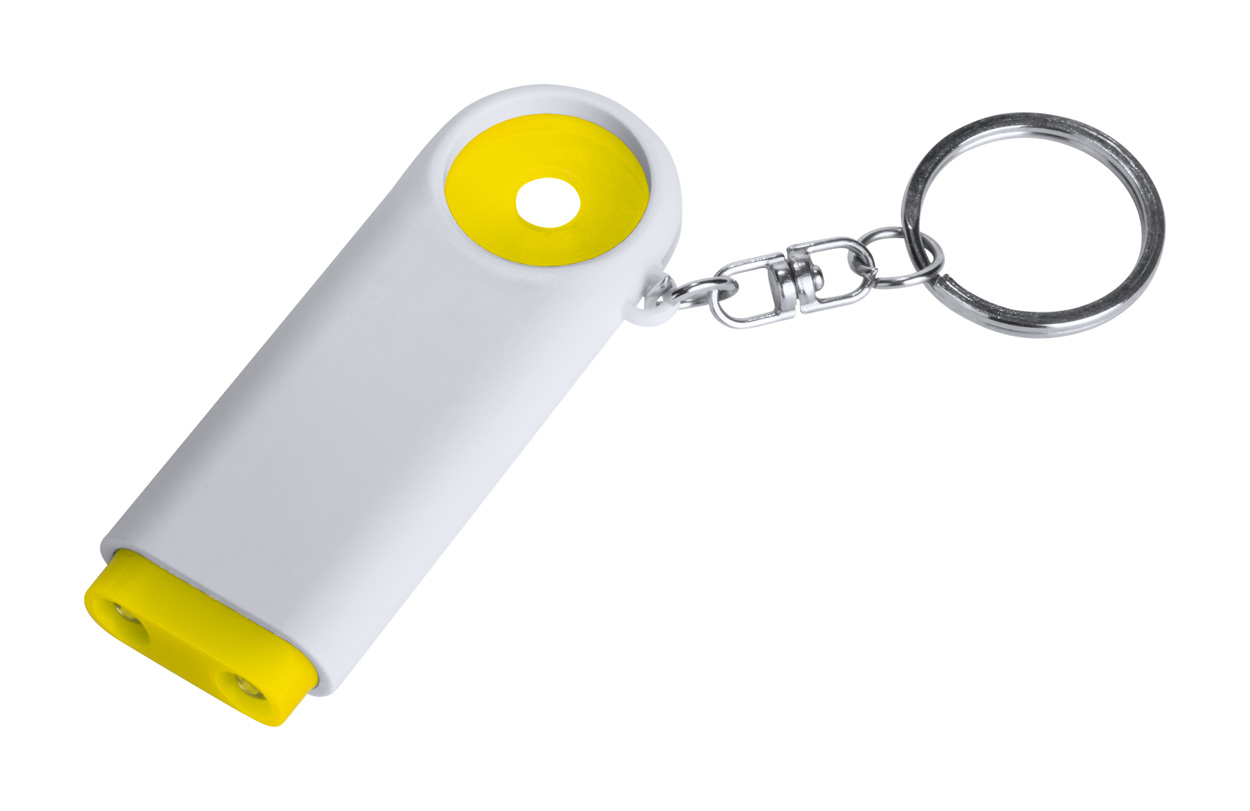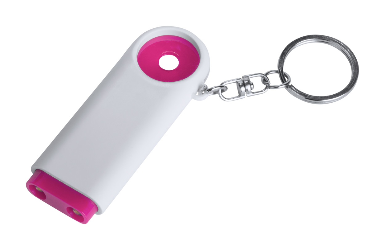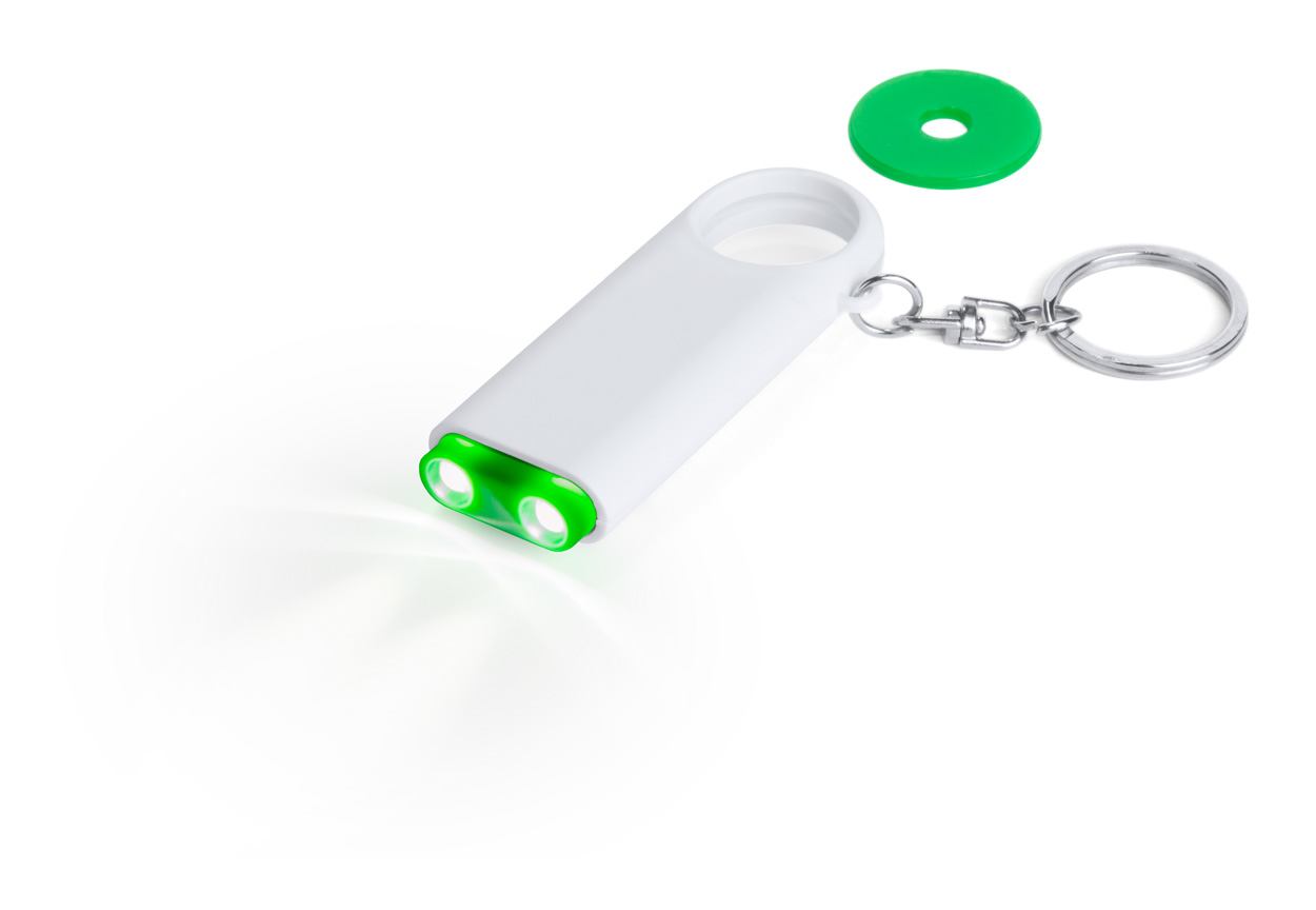 Plastic sleutelhanger met munt voor een winkelwagen en 2 LED lampjes. Met knoopcel batterijen.