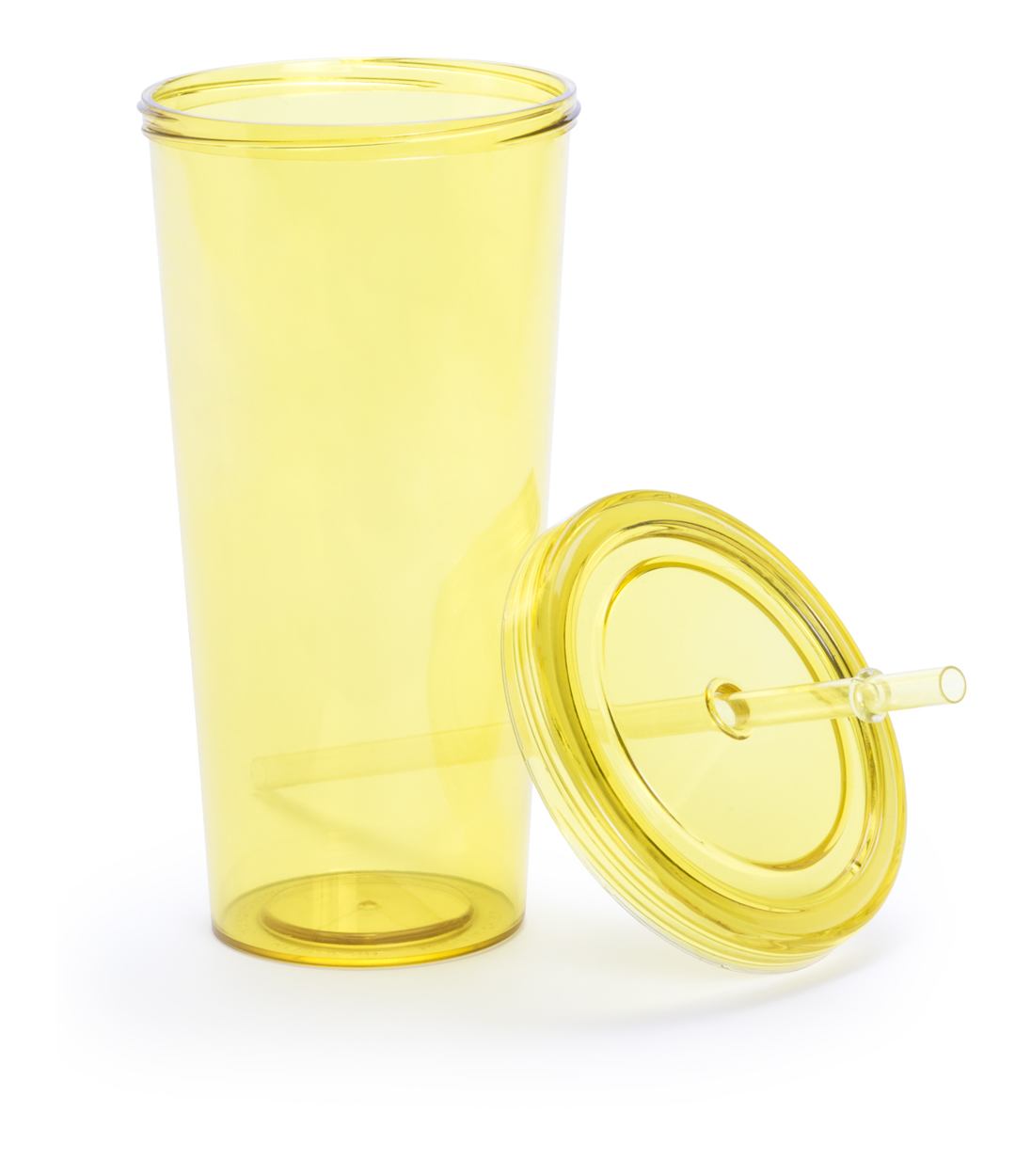 Gekleurde transparante plastic beker met rietje. Inhoud: 750 ml.