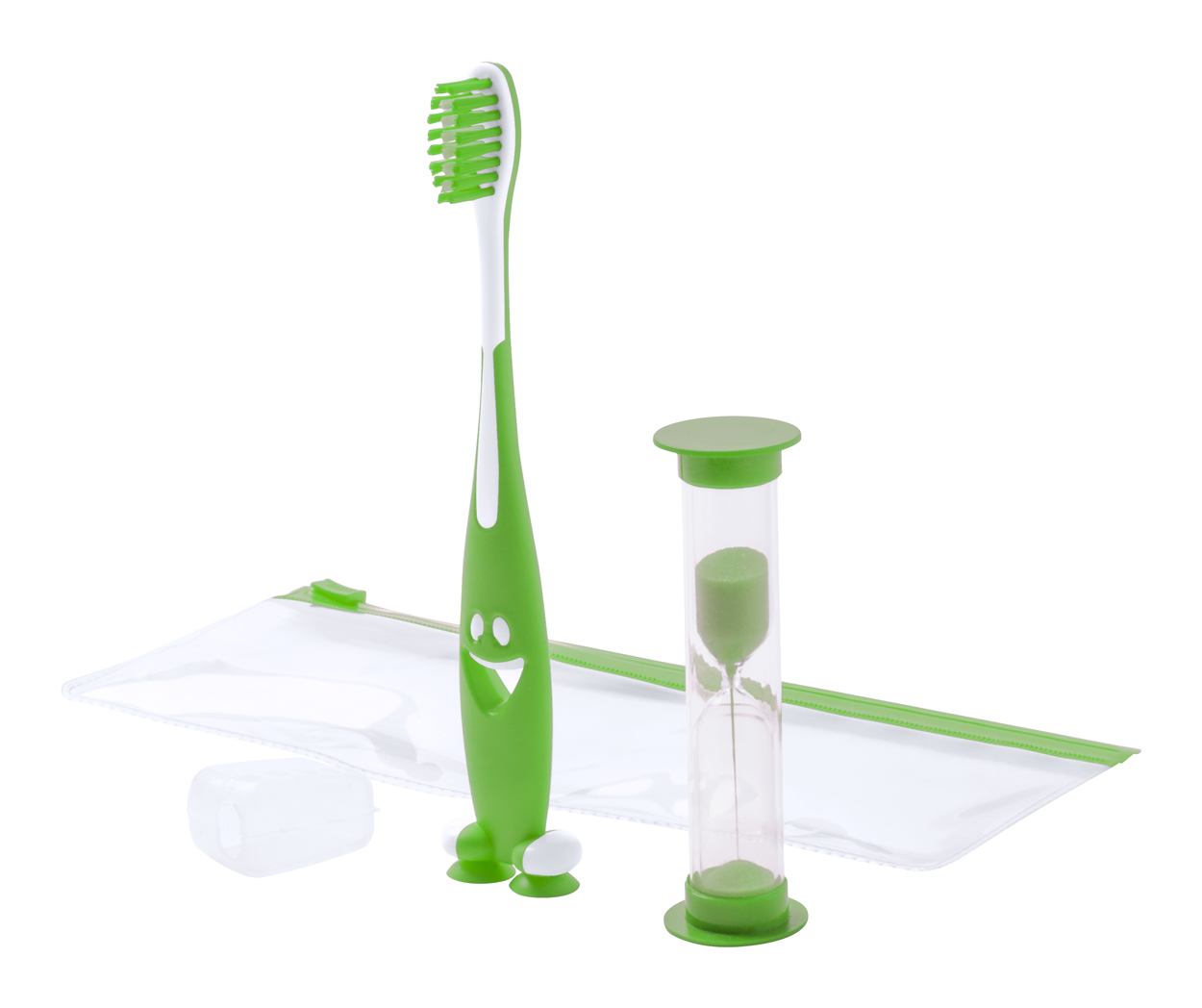 Tandenborstel set voor kinderen met plastic tandenborstel en zandloper. Plastic zak met rits.