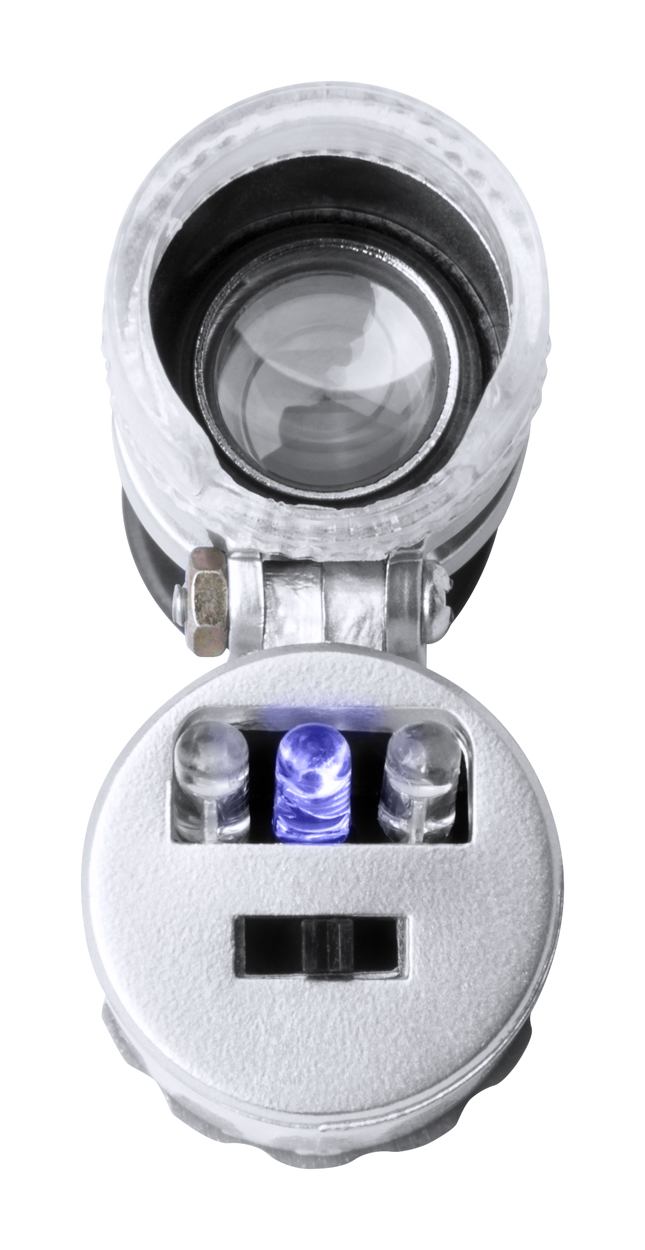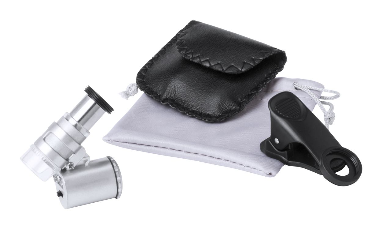 Universele microscope voor mobiele telefoon. Vergroot 60x en heeft ingebouwde LED verlichting (normaal/geld detector). Met knoopcel batterij, geleverd in PU lederen pouch. Materiaal: ABS/Metaal.