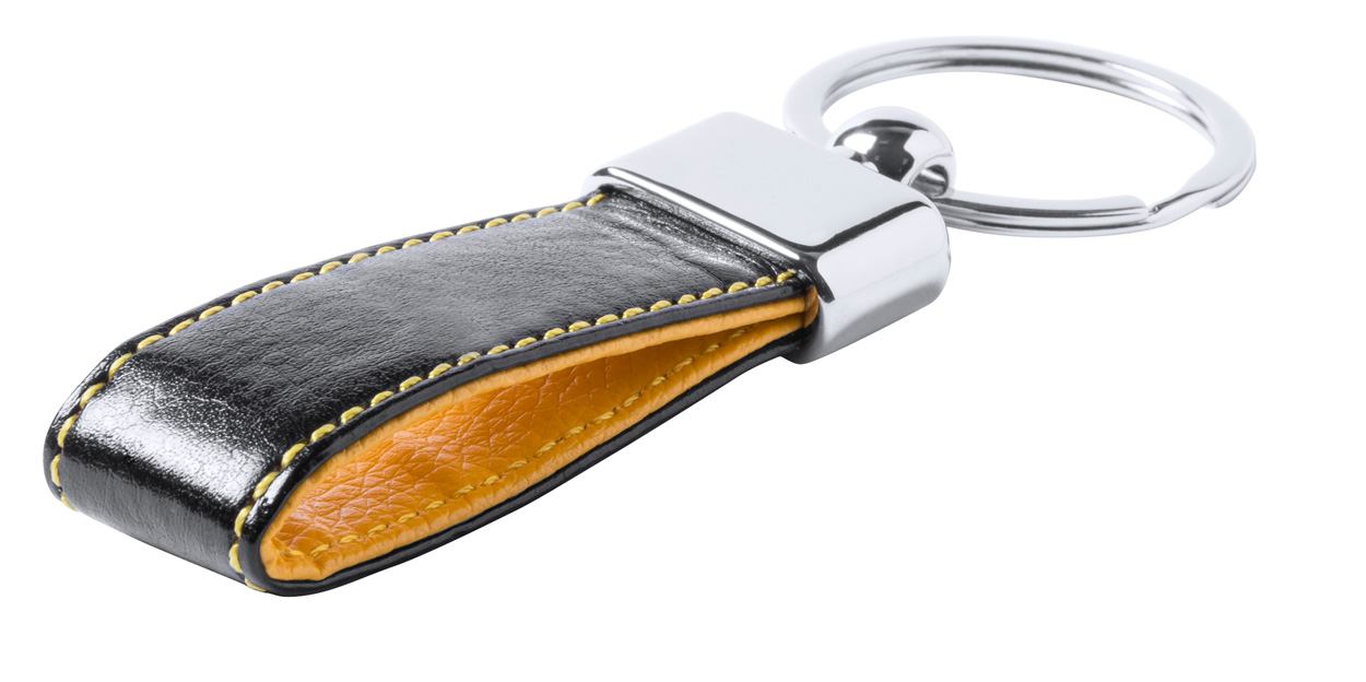 Sleutelhanger van PU leder en metaal, in zwarte geschenkverpakking.
