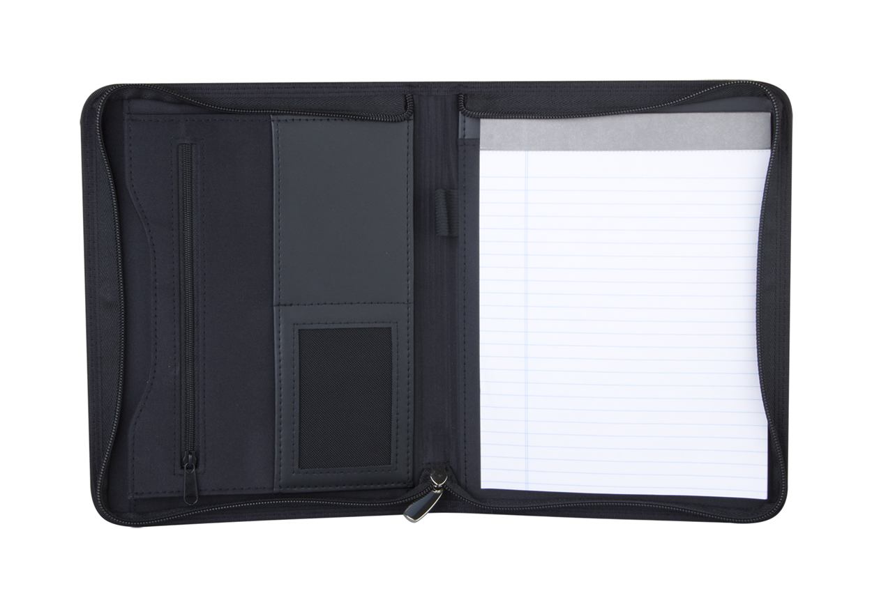 Zwarte lederen documenten map met rits. Met notitieboekje met 30 pagina's en visitekaarthouder en pen. Met geritste binnenzak.