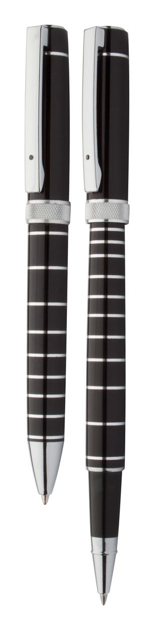 André Philippe. Moderne aluminium pennenset met een balpen en een rollerpen. Met glimmende punt en aluminium decoratie in zwarte geschenkverpakking. Blauw schrijvend.