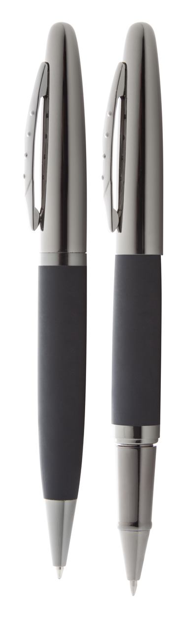 Elegante metalen balpen en rollerpen met rubberen houder en gunmetal gedeeltes. In zwarte geschenkverpakking. Blauw schrijvend.