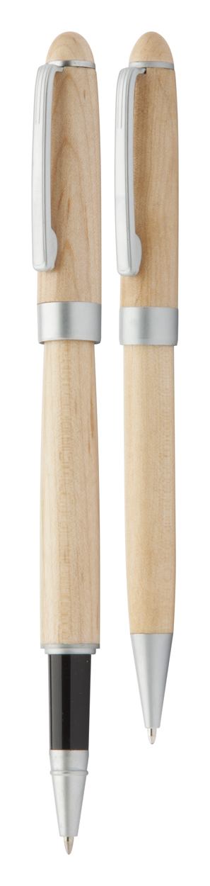 Houtkleur houten pennenset met balpen en rollerpen in geschenkverpakking. Blauw schrijvend.