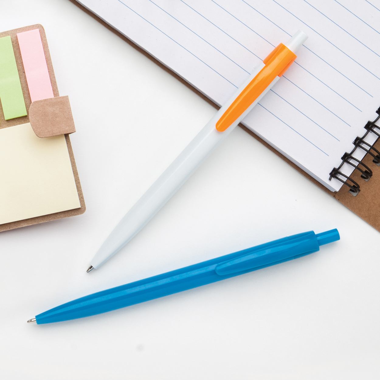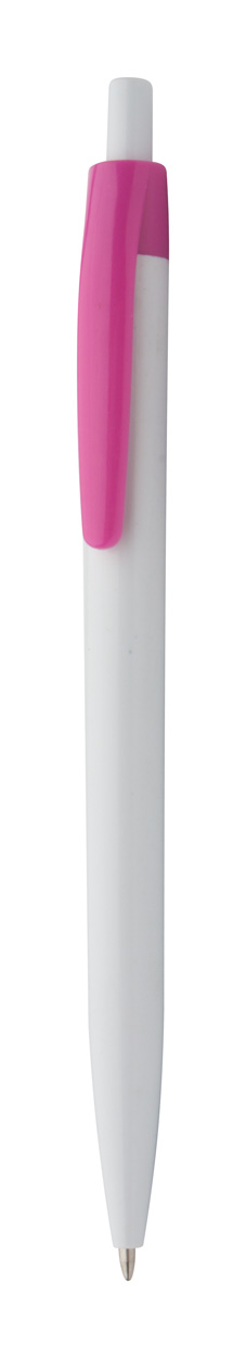 Witte plastic balpen met gekleurde clip. Blauw schrijvend.