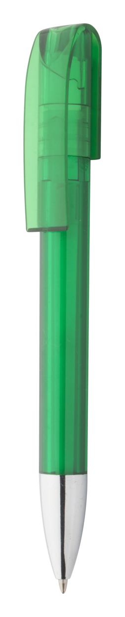 Plastic balpen, transparant gekleurd. Met chromen uiteinde, blauw schrijvend.
