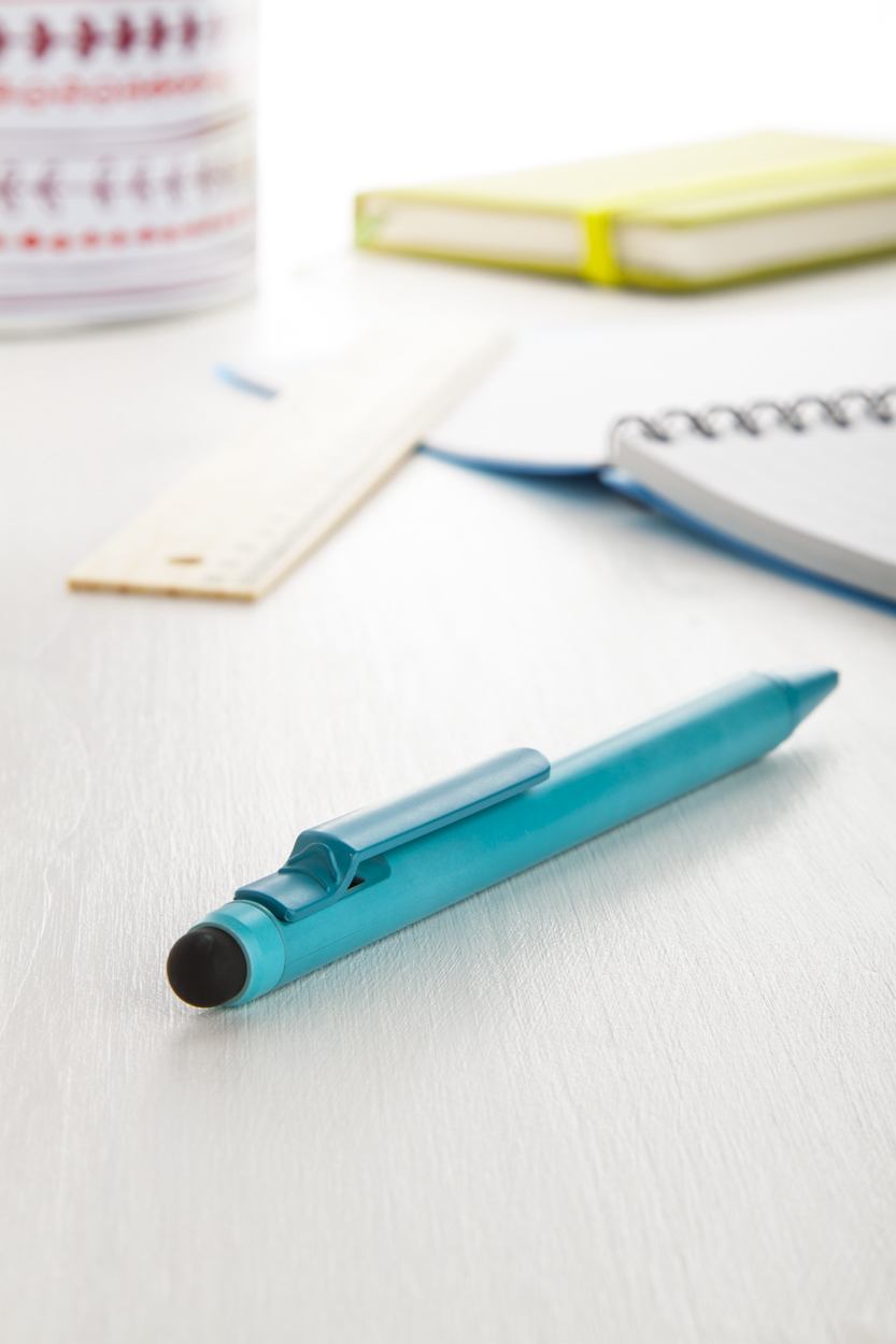 Plastic balpen met touchscreen tip gedeelte en matte afwerking. Blauw schrijvend.
