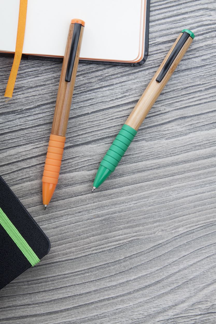 Bamboe balpen met metalen clip, gekleurde tip en bijpassende gekleurde rubberen grip. Blauw schrijvend.